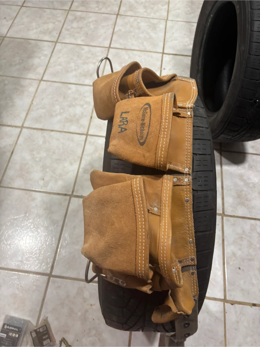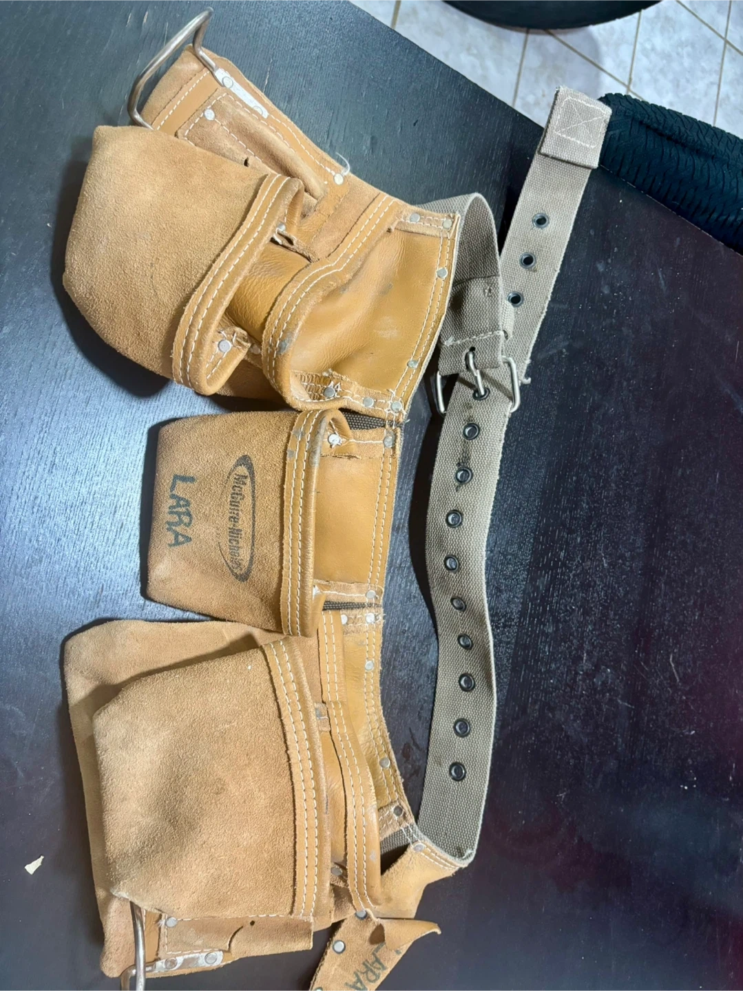 Selling a used leather tool belt from McGuire-Nicholas. It has multiple pockets and loops for holding various tools. The belt is adjustable and made of durable leather. It shows signs of wear but is still functional and ready for use!