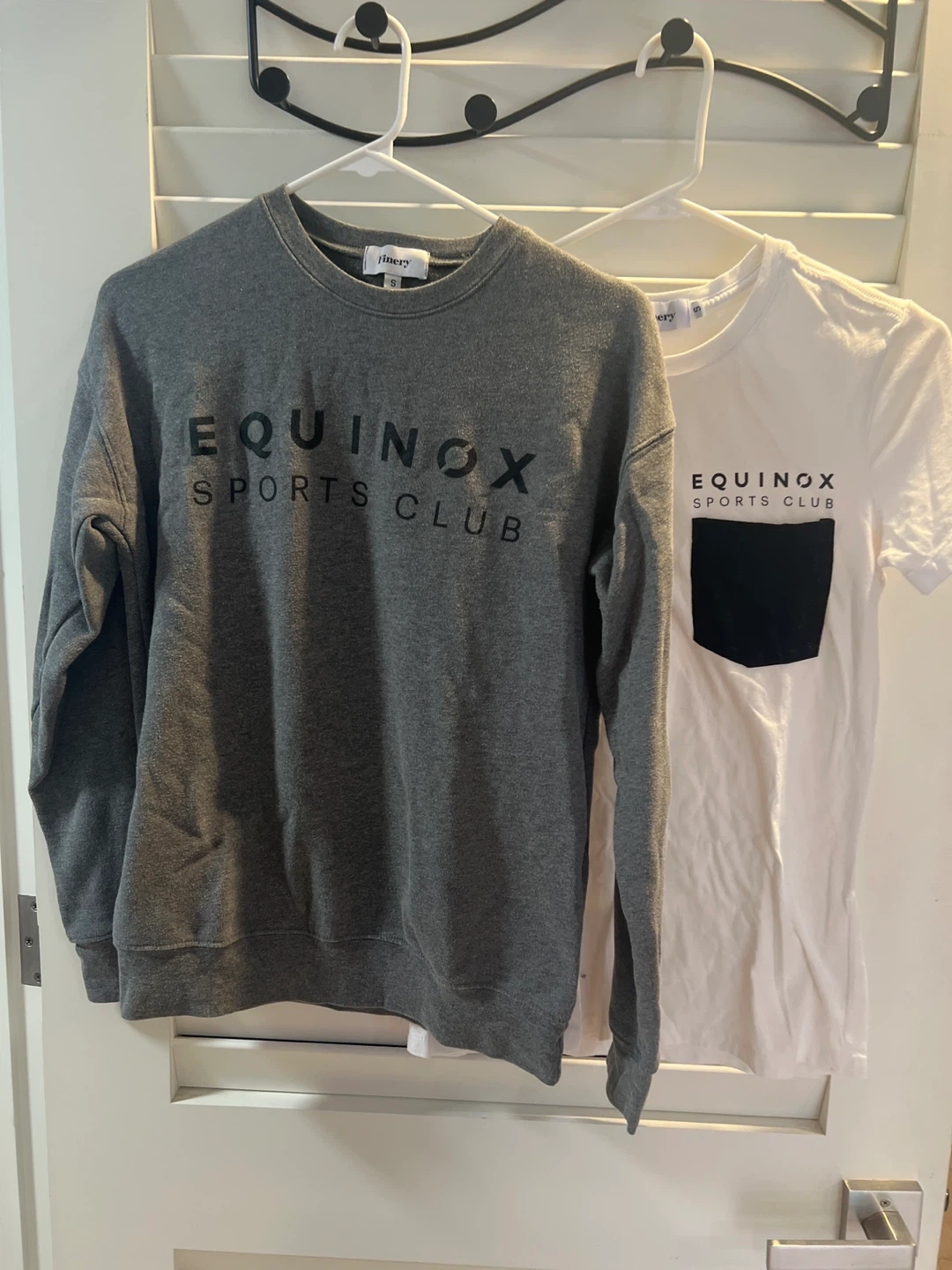Selling an Equinox Sports Club sweatshirt and t-shirt set! Both are size small. The sweatshirt is gray and the t-shirt is white with a black pocket. Great for workouts or casual wear! Size small women’s.