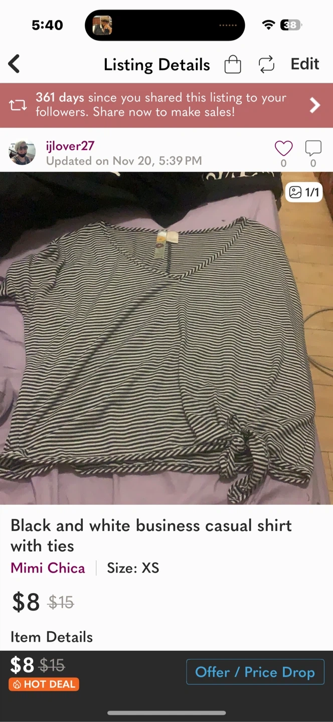 Selling a Mimi Chica black and white striped business casual shirt with ties. It's a size XS and originally listed for $15!