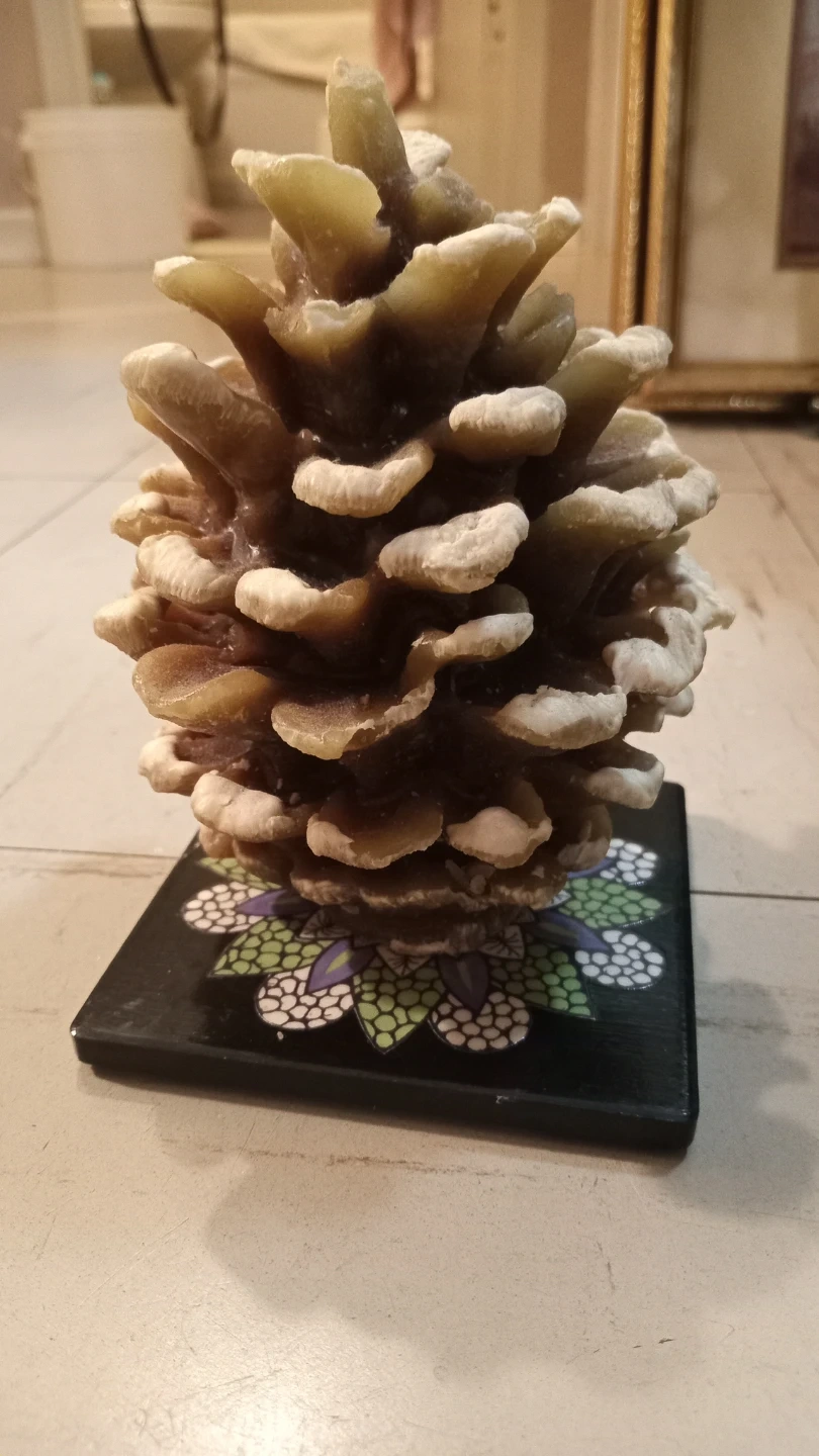 This is a pine cone-shaped candle on a decorative base. It's a unique piece that would add a cozy touch to any room. 6 inch high