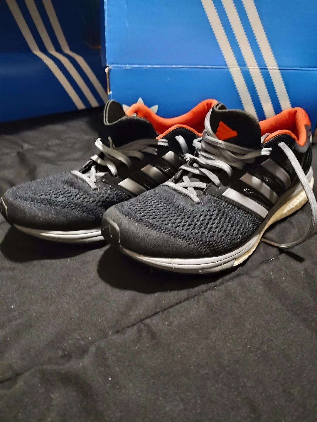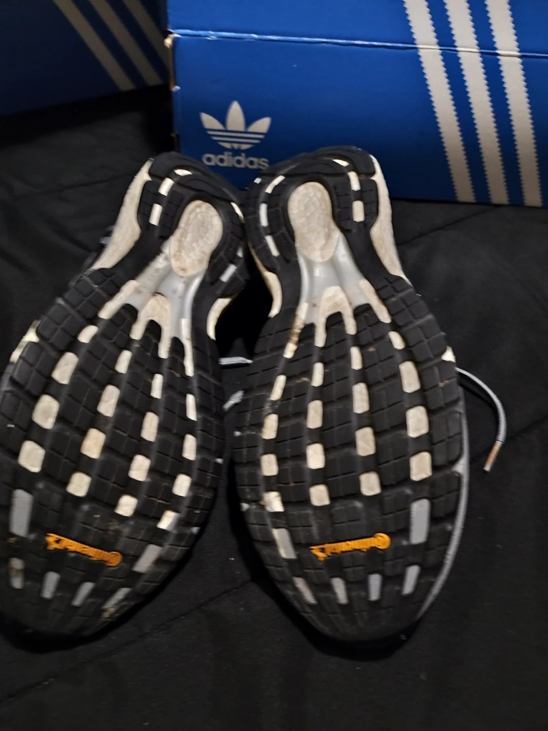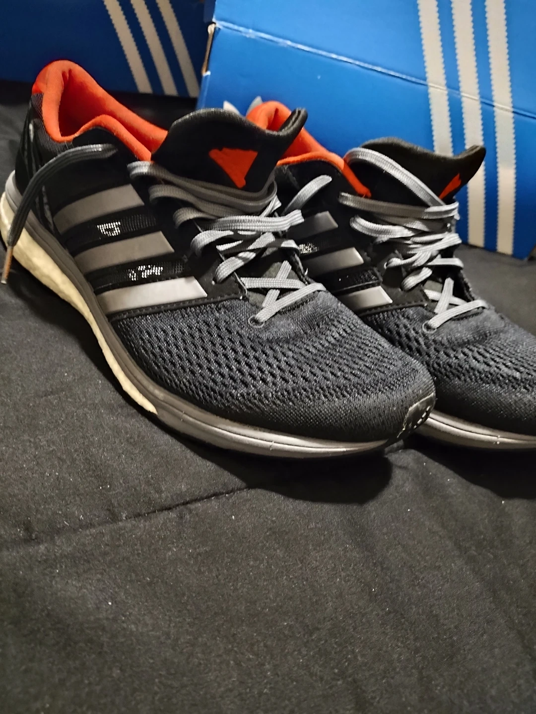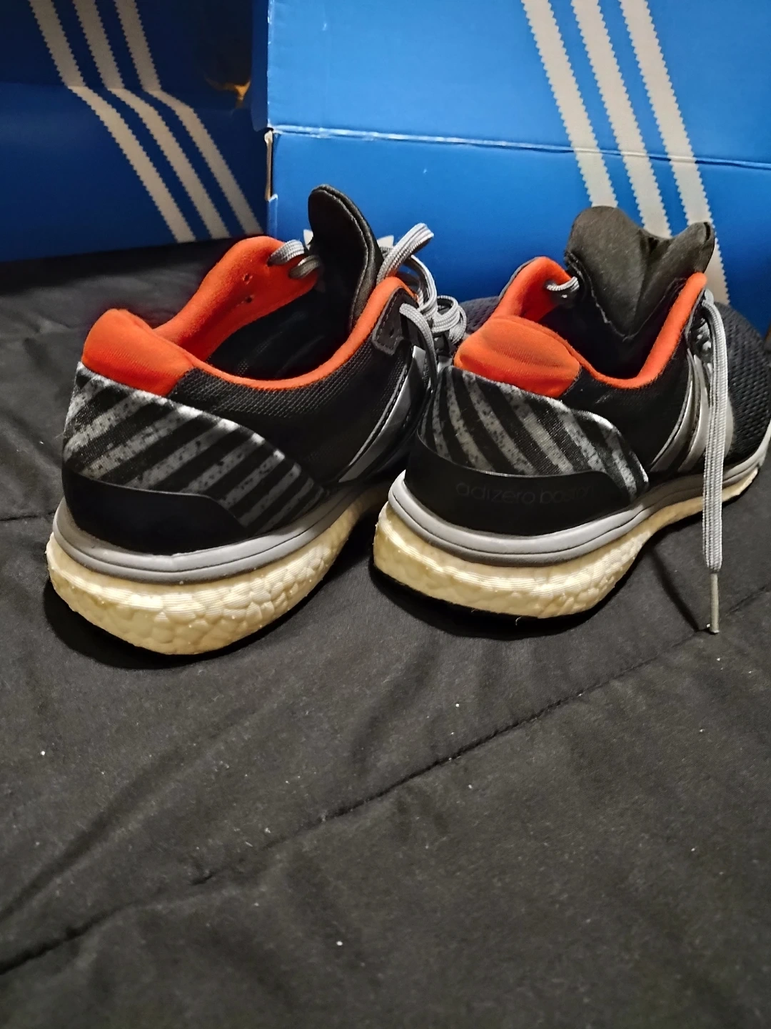 Selling a pair of Adidas Adizero Boost running shoes. They show some signs of wear on the soles, but the uppers are in good condition. Great for running or casual wear!