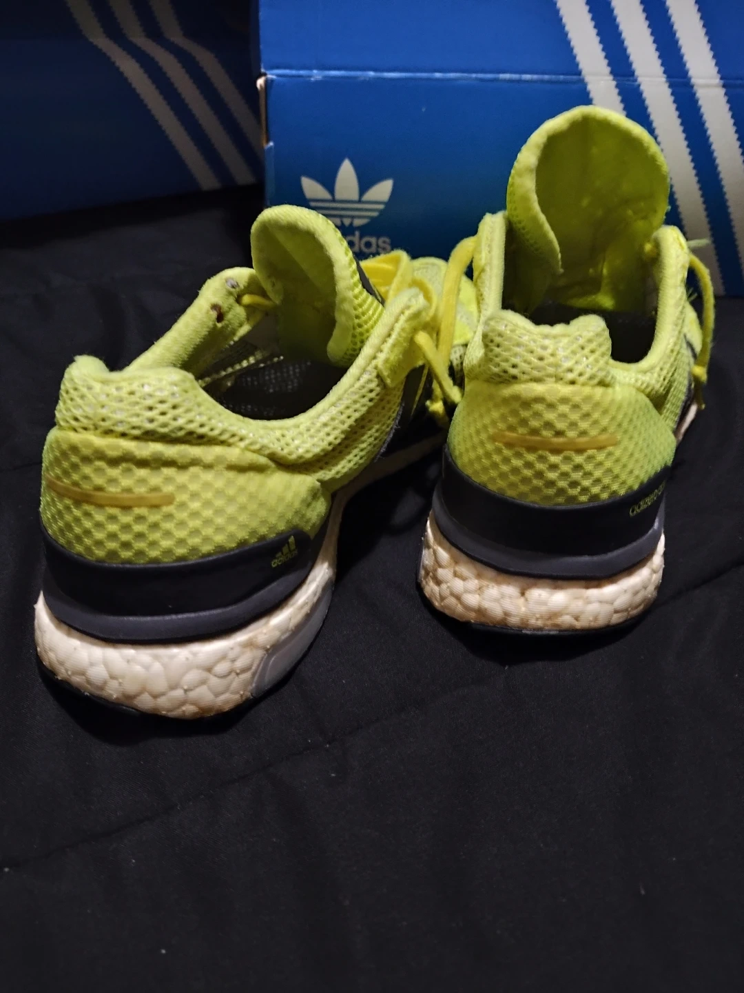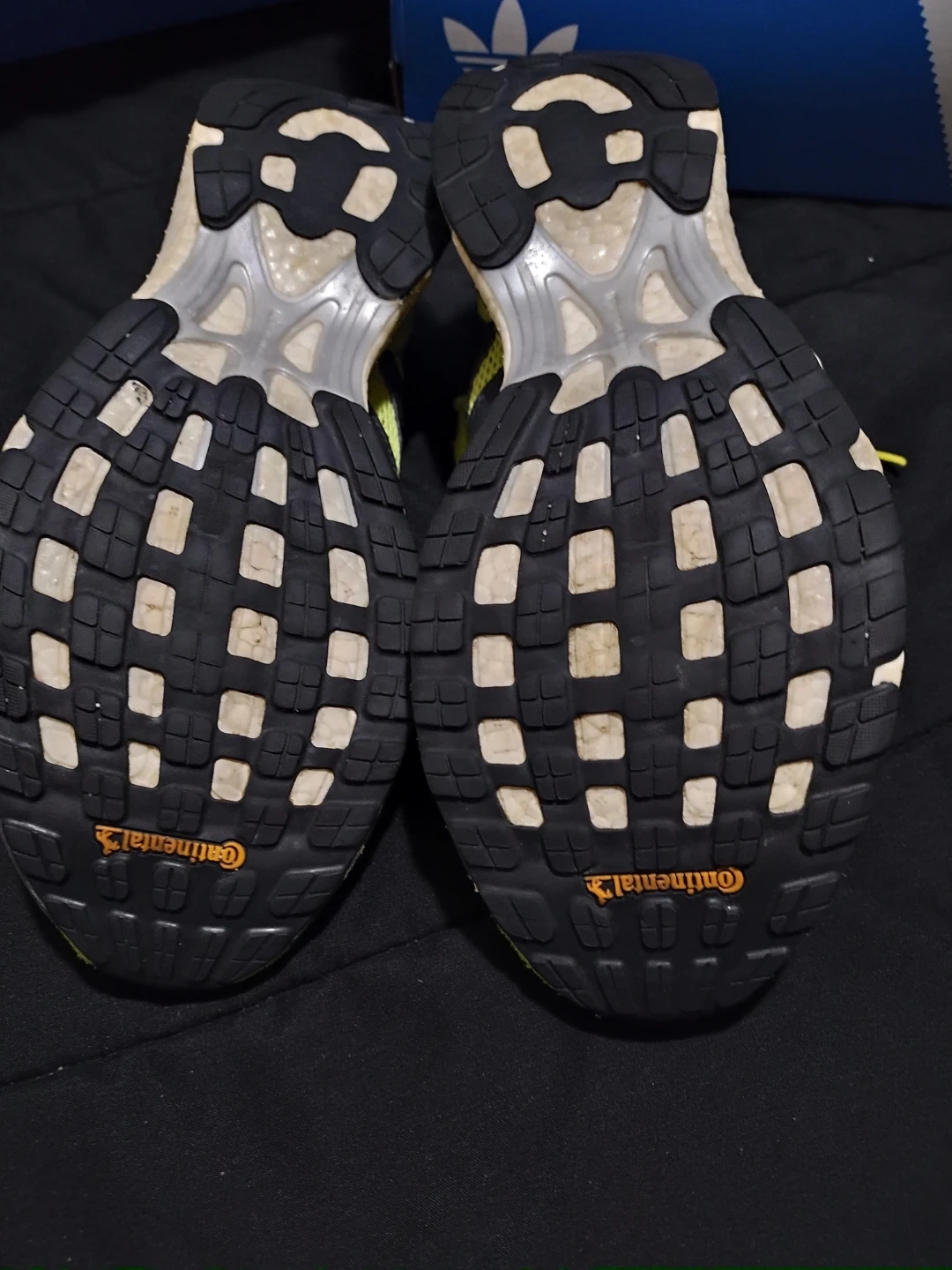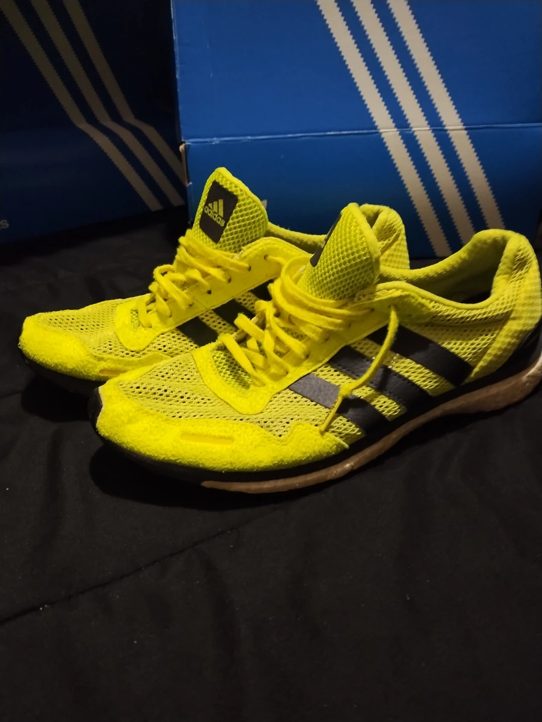 Selling a pair of Adidas Adizero Adios running shoes in yellow. They show signs of wear but still have plenty of life left. The soles are Continental rubber for great grip. Comes with the original box!