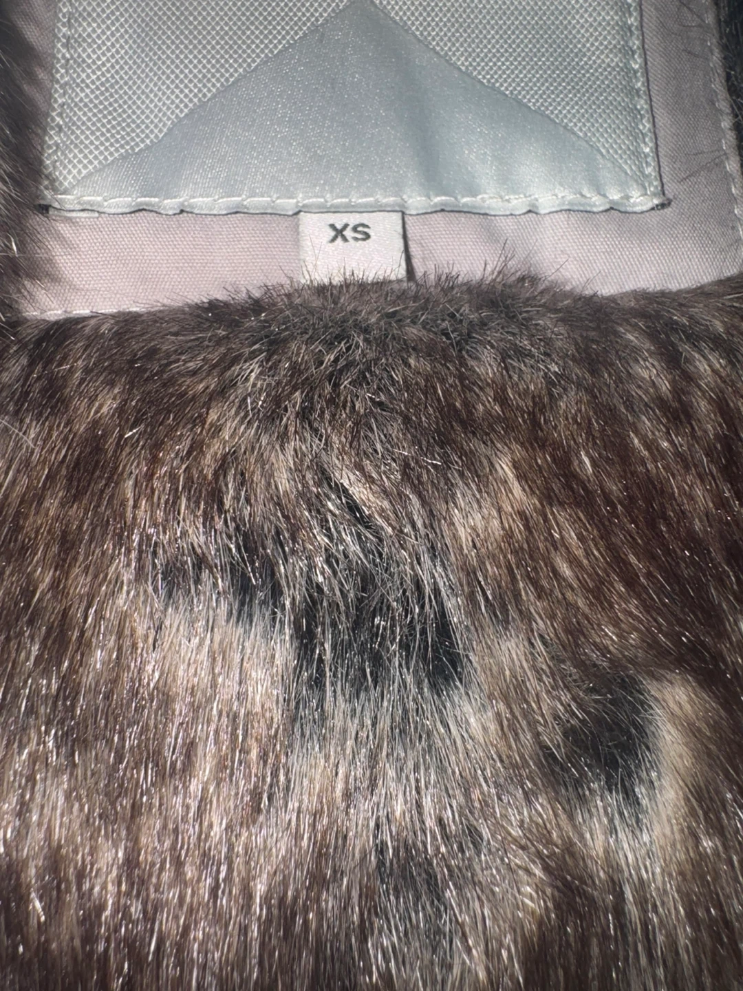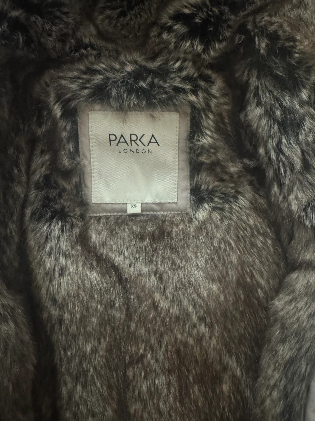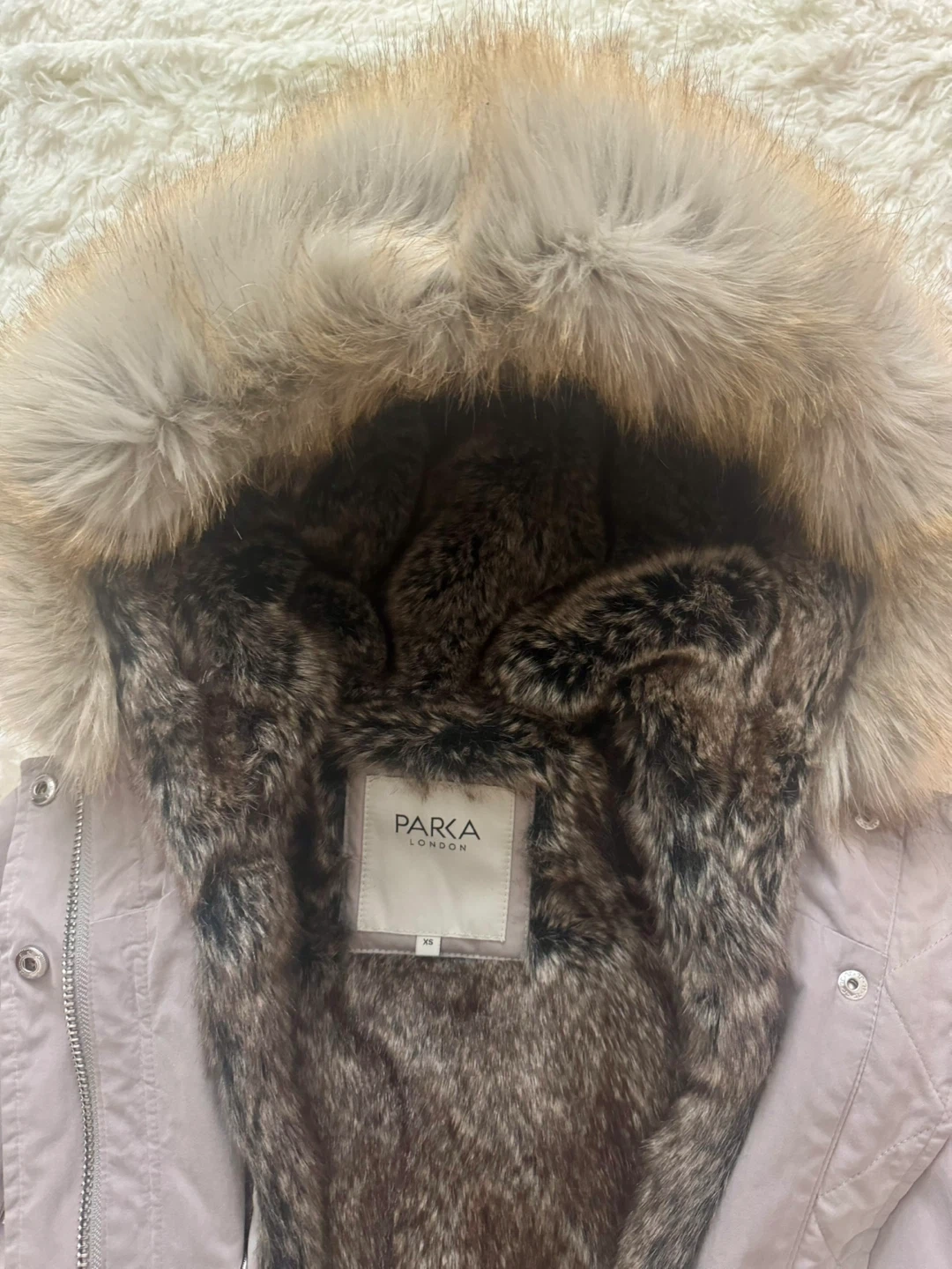 Selling a PARKA LONDON coat in size XS. Running a little big. It features a stylish fur hood, perfect for staying warm and fashionable during colder weather. The coat appears to be in good condition and ready for a new home!