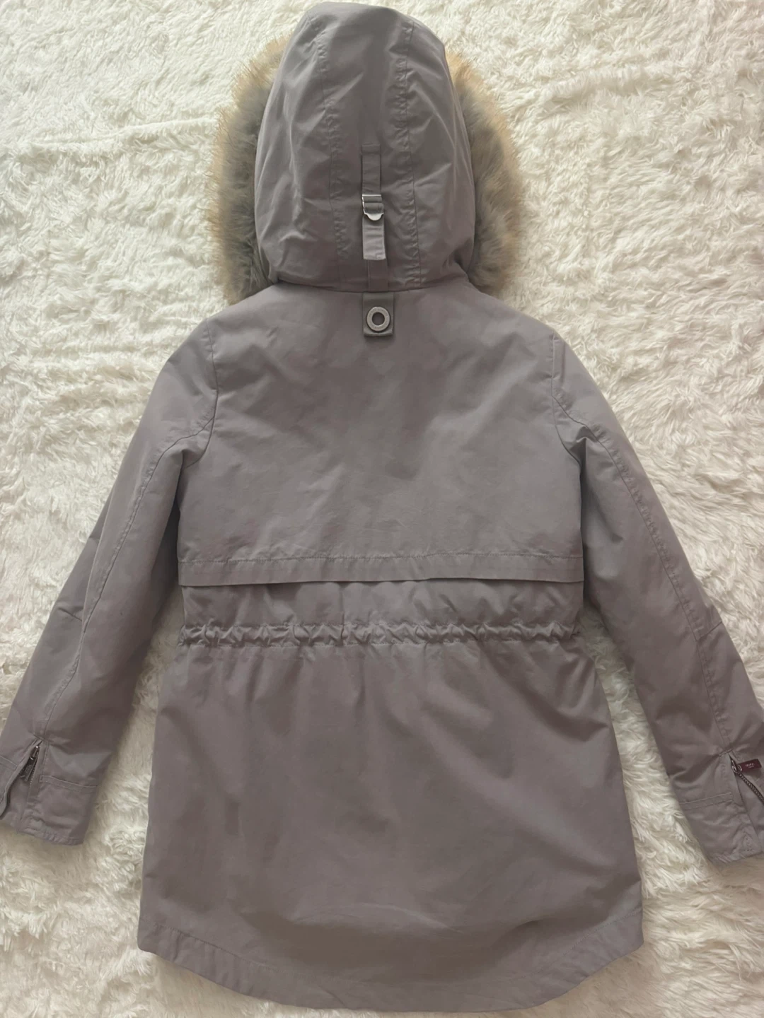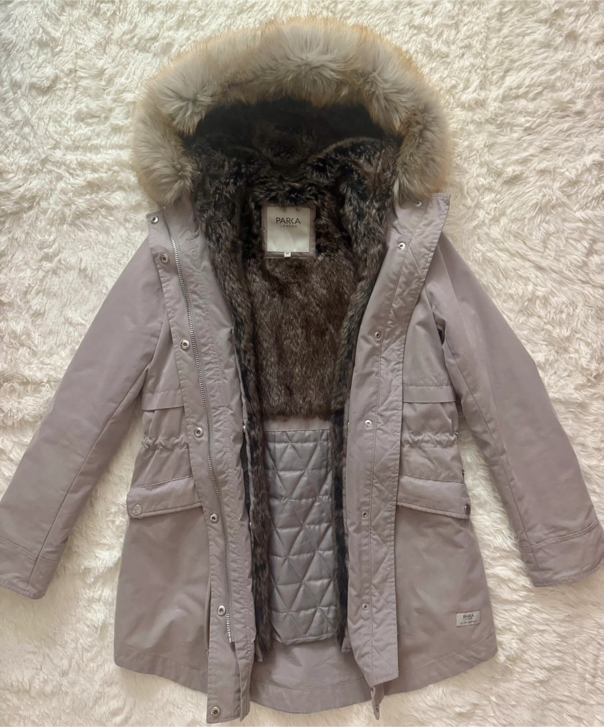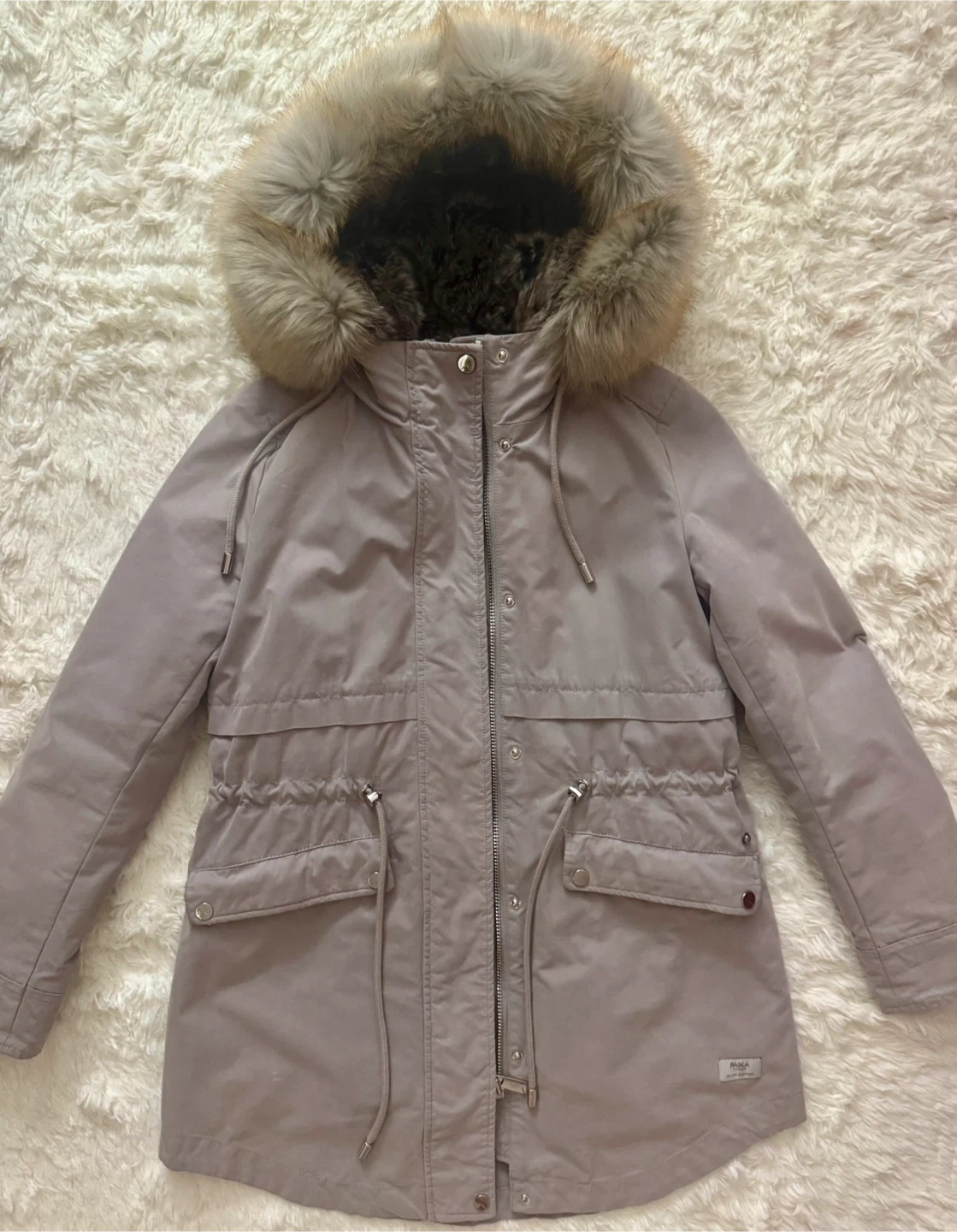 Selling a PARKA LONDON coat in size XS. Running a little big. It features a stylish fur hood, perfect for staying warm and fashionable during colder weather. The coat appears to be in good condition and ready for a new home!