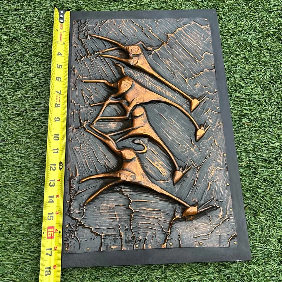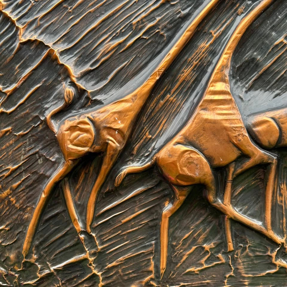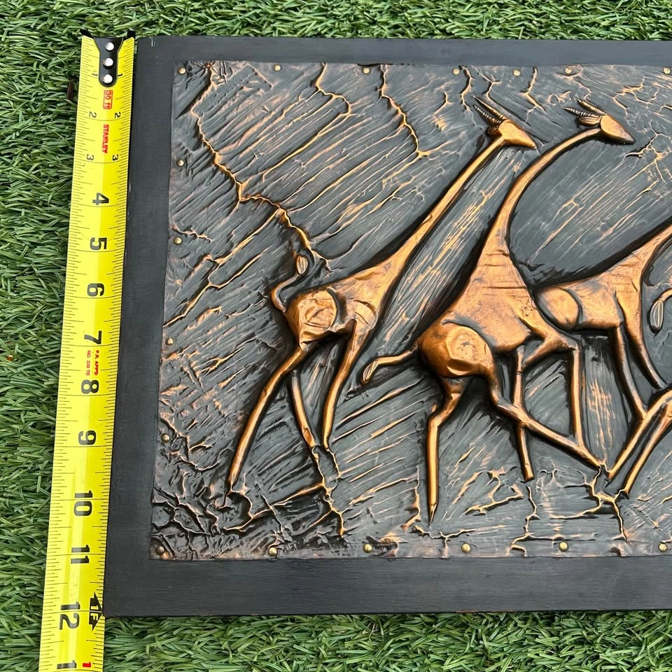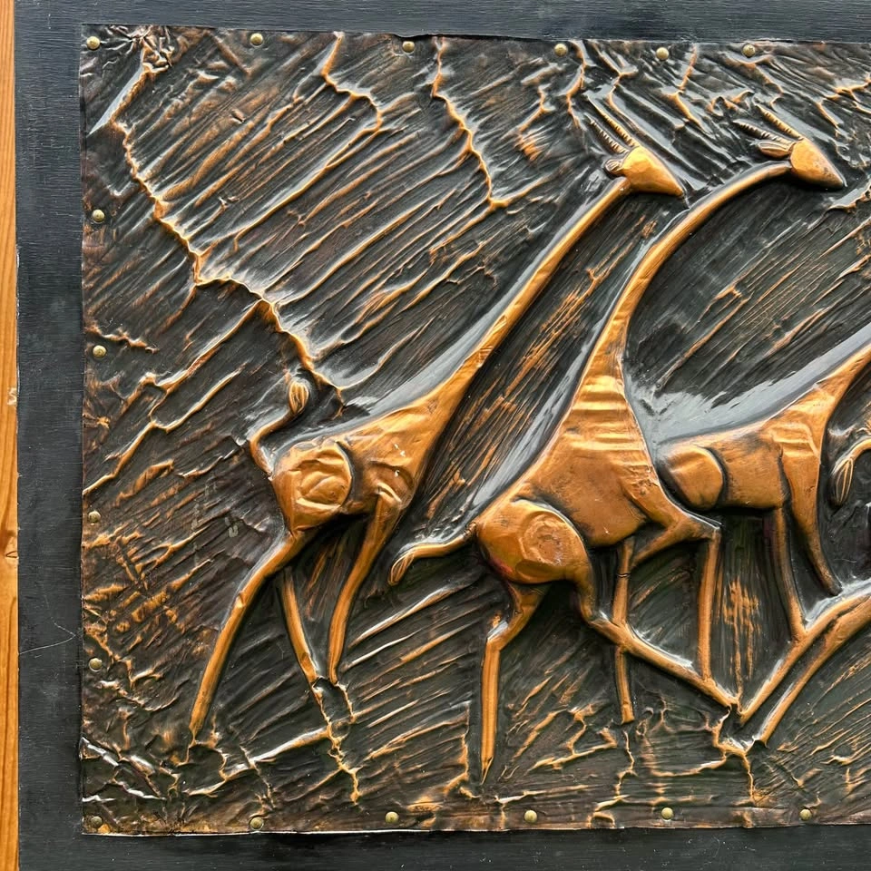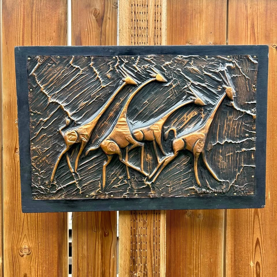 Beautiful vintage African wall art by W.M. Mawasha featuring a textured copper-tone relief of stylized giraffes. The artwork is mounted on a wooden board with a dark frame, showcasing expressive movement and detailed handcrafted texture. A striking piece of mid-century African decor — perfect for collectors or as a bold wall accent. Some light edge wear consistent with age.