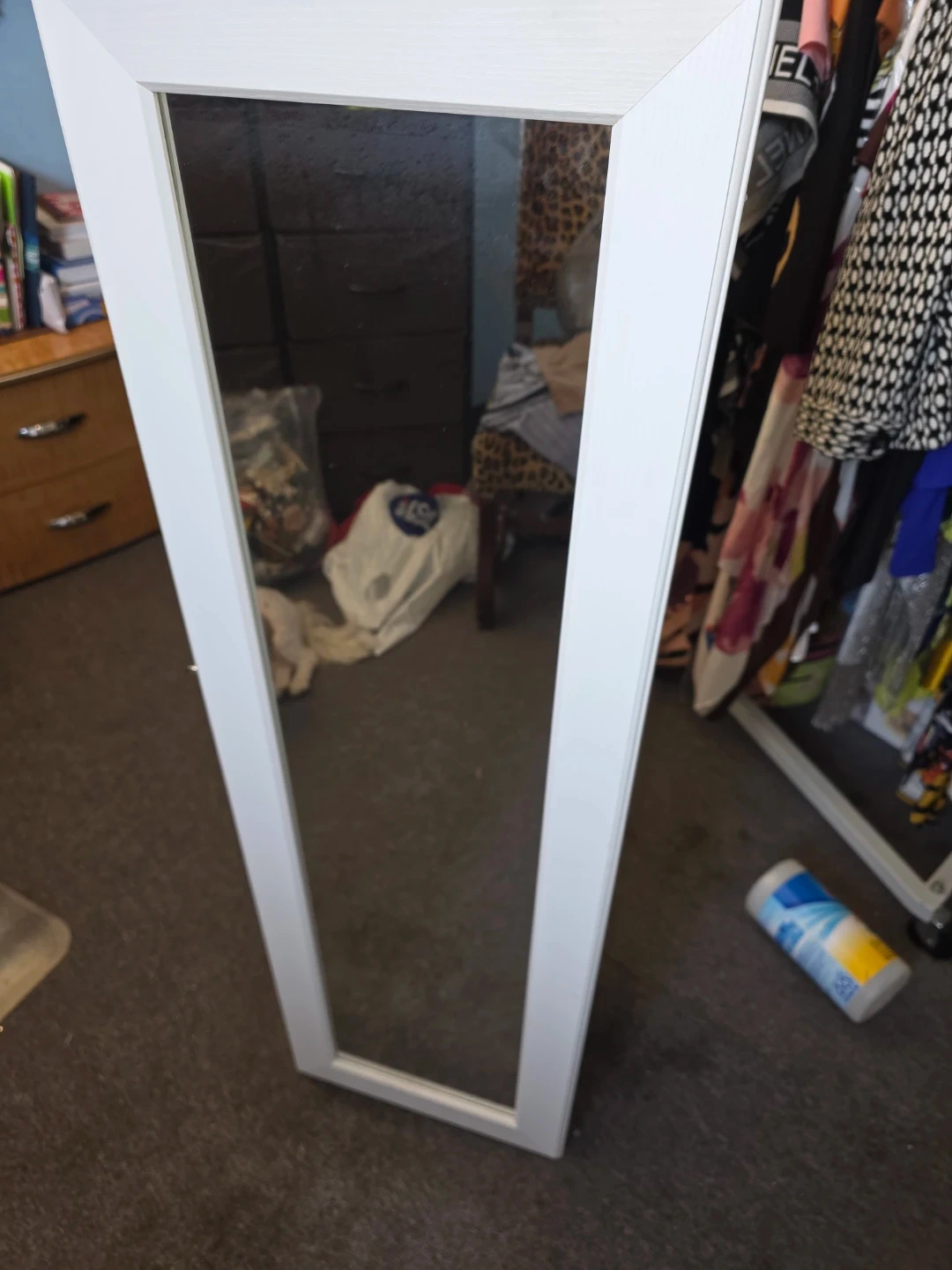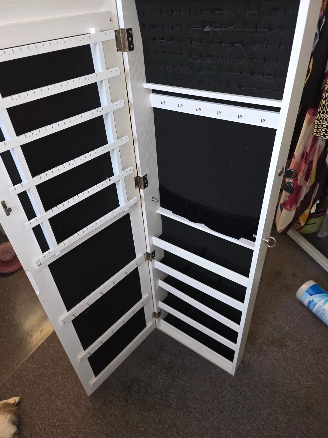 Selling a white jewelry armoire with a mirror! It's in great condition and ready to help organize all your jewelry and accessories. The inside is lined with black felt and has lots of hooks and shelves. No legs either wall mount or floor.