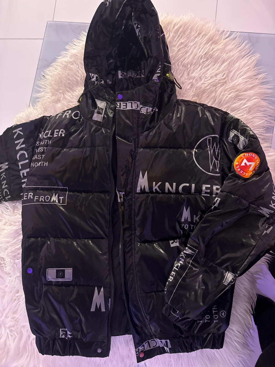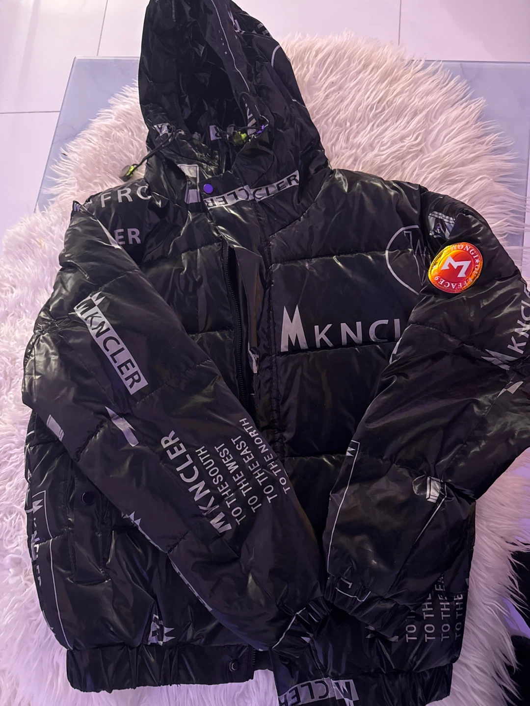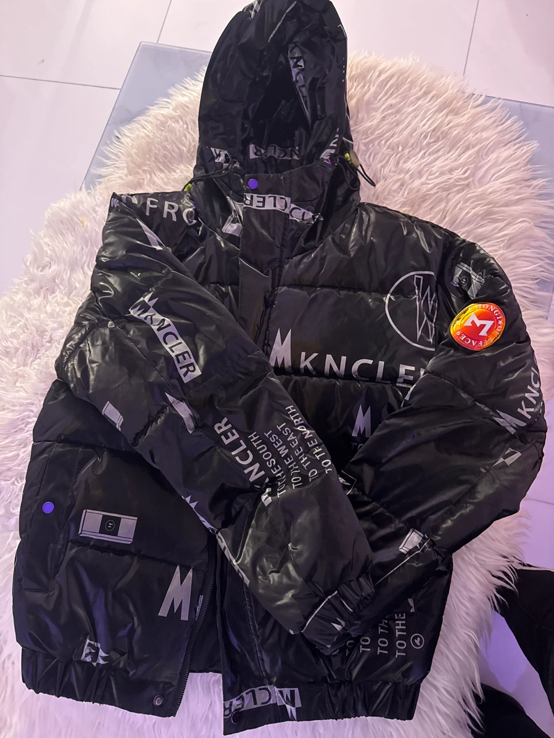 Kid Selling a Moncler padded jacket in black. It has a unique design with text and logos all over. It's in great condition and ready for a new home!