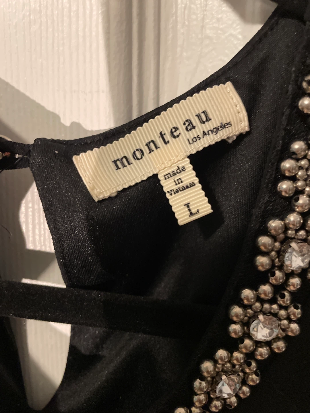 Selling a lovely black tank top from Monteau Los Angeles. It features beautiful embellishments around the neckline and is a size L. Perfect for dressing up or down!