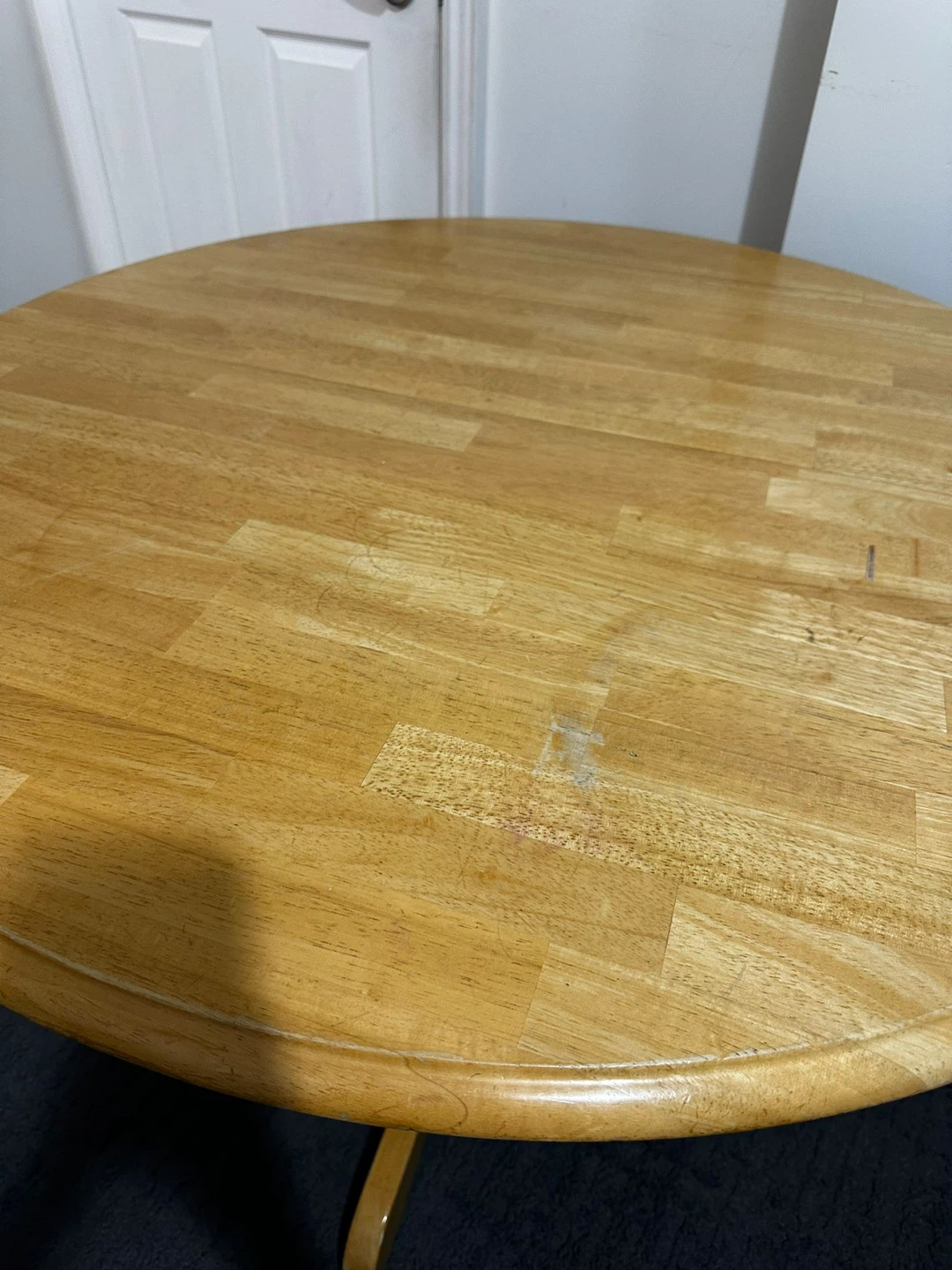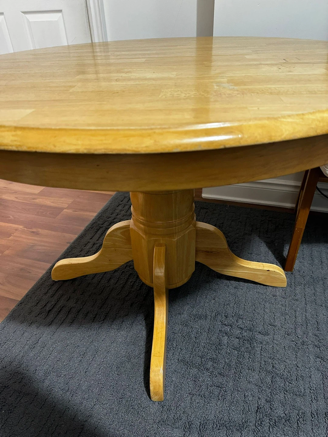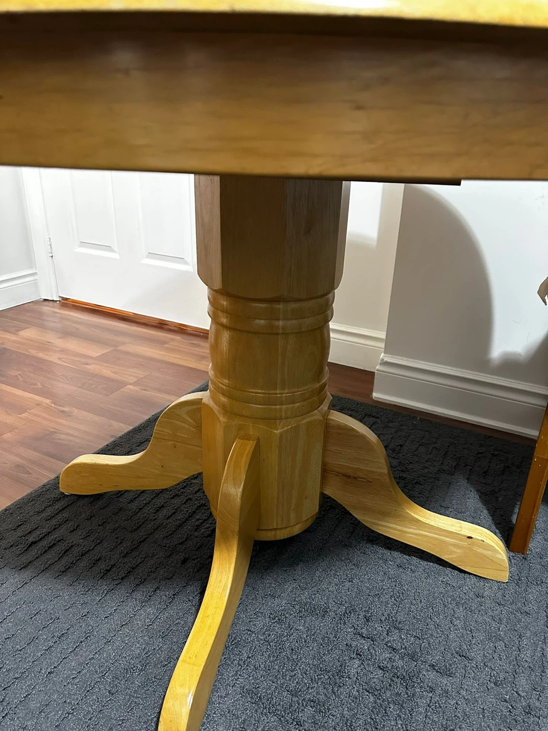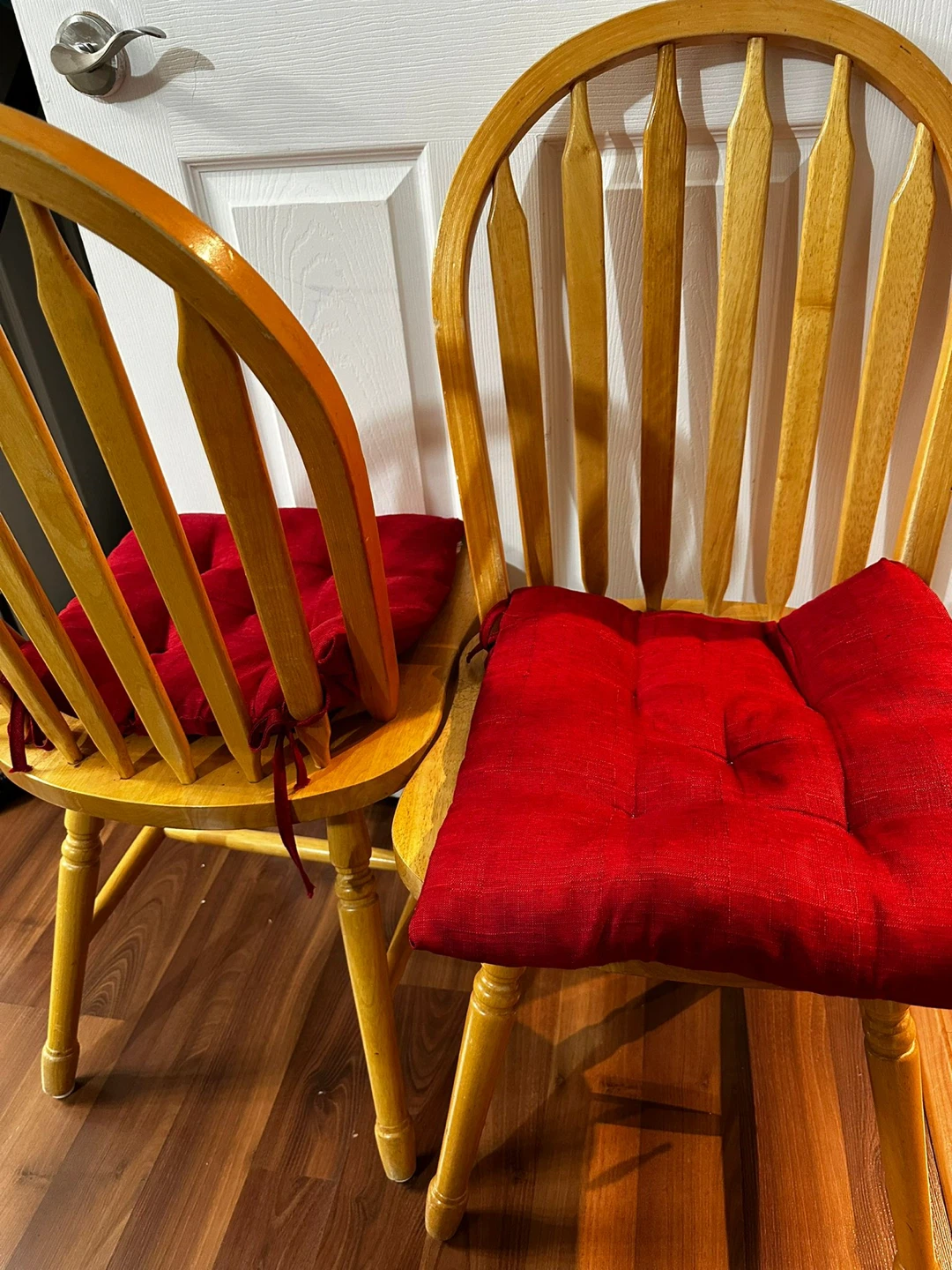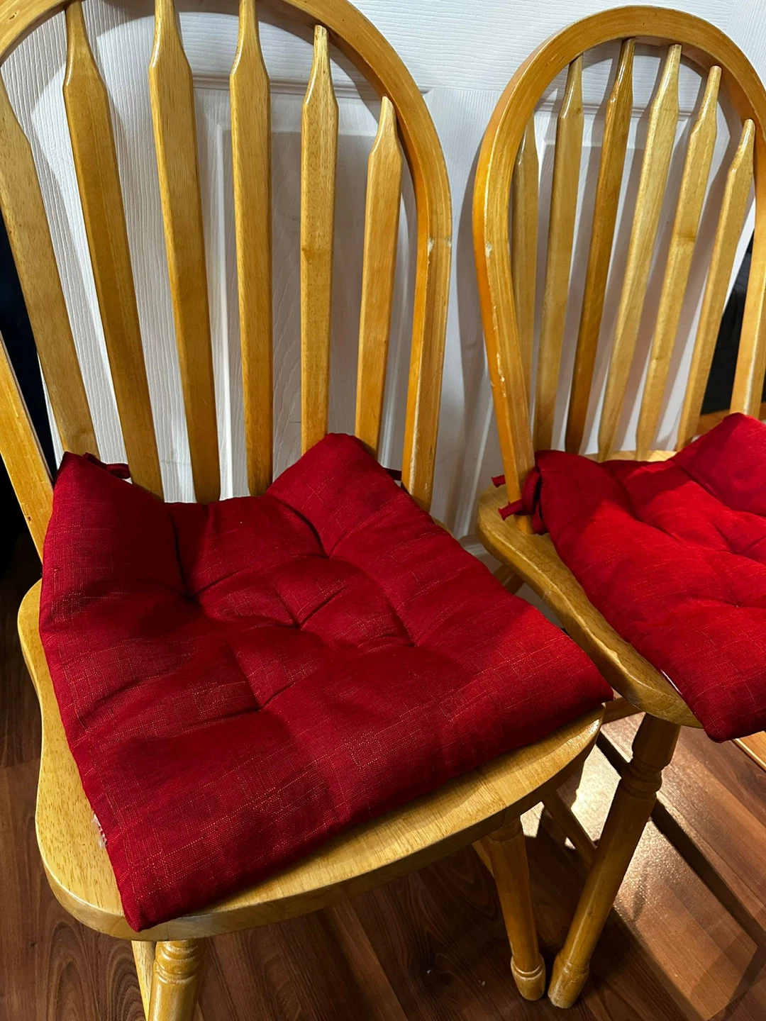 Selling a wooden dining table with two matching chairs. The chairs have red cushions for added comfort. The table shows some signs of wear, but is still sturdy and functional. Perfect for a small dining area or kitchen!