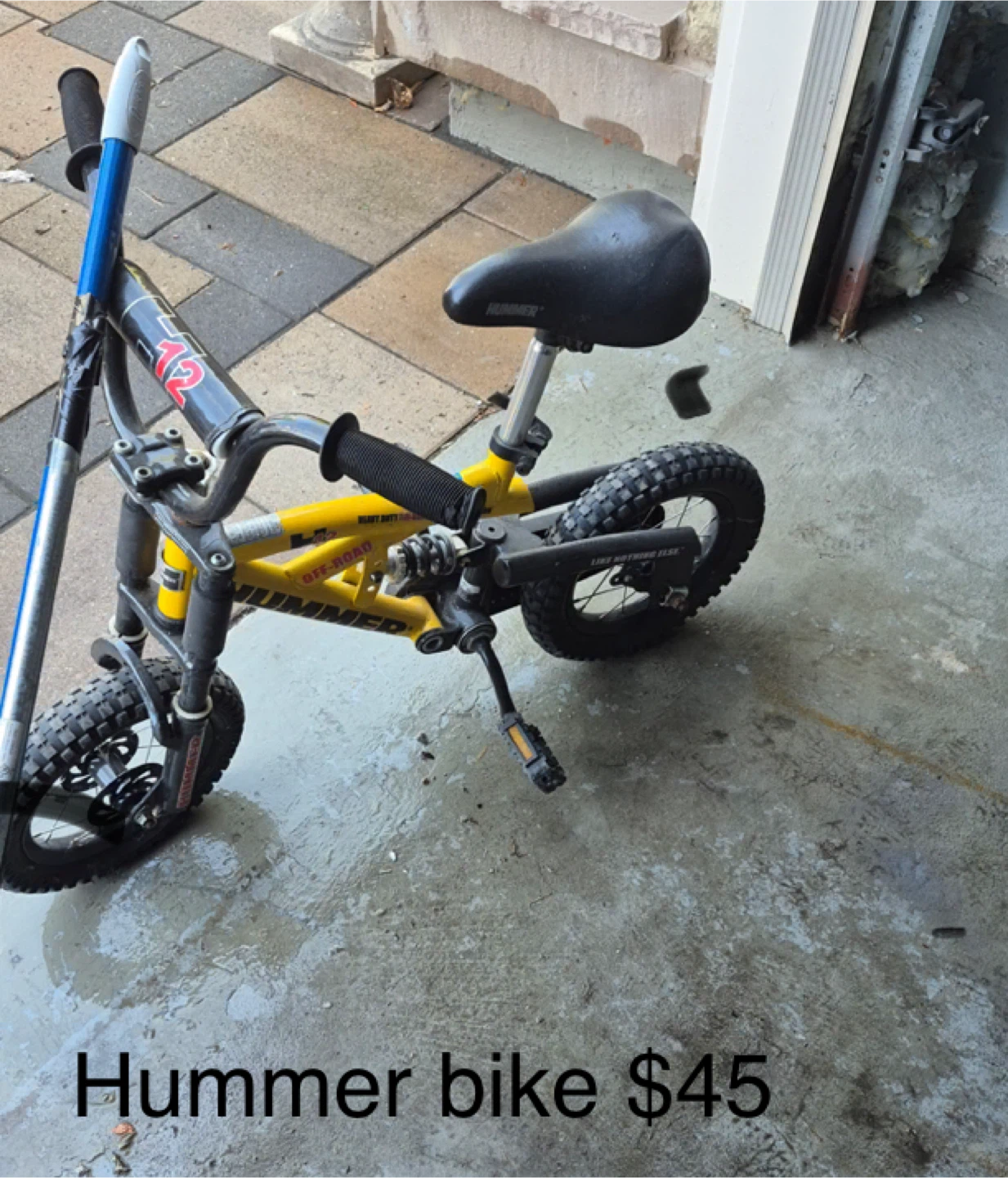 1 / 11 / 1Buy & SellHummer Off-Road Kids BikeHummer Off-Road Kids Bike$45Selling a Hummer off-road bike for kids. It's in good condition and ready for a new rider! $45.00ConditionGoodWHERE TO MEETVaughanView MapSELLERMariaWoodbridge100 reviews0 chats·0 favorites·33 viewsSEND CHAT TO SELLERHi Maria! I’m interested in your listing.Hi Maria! I’m interested in your listing.Get the Karrot app to chatSign In to chat