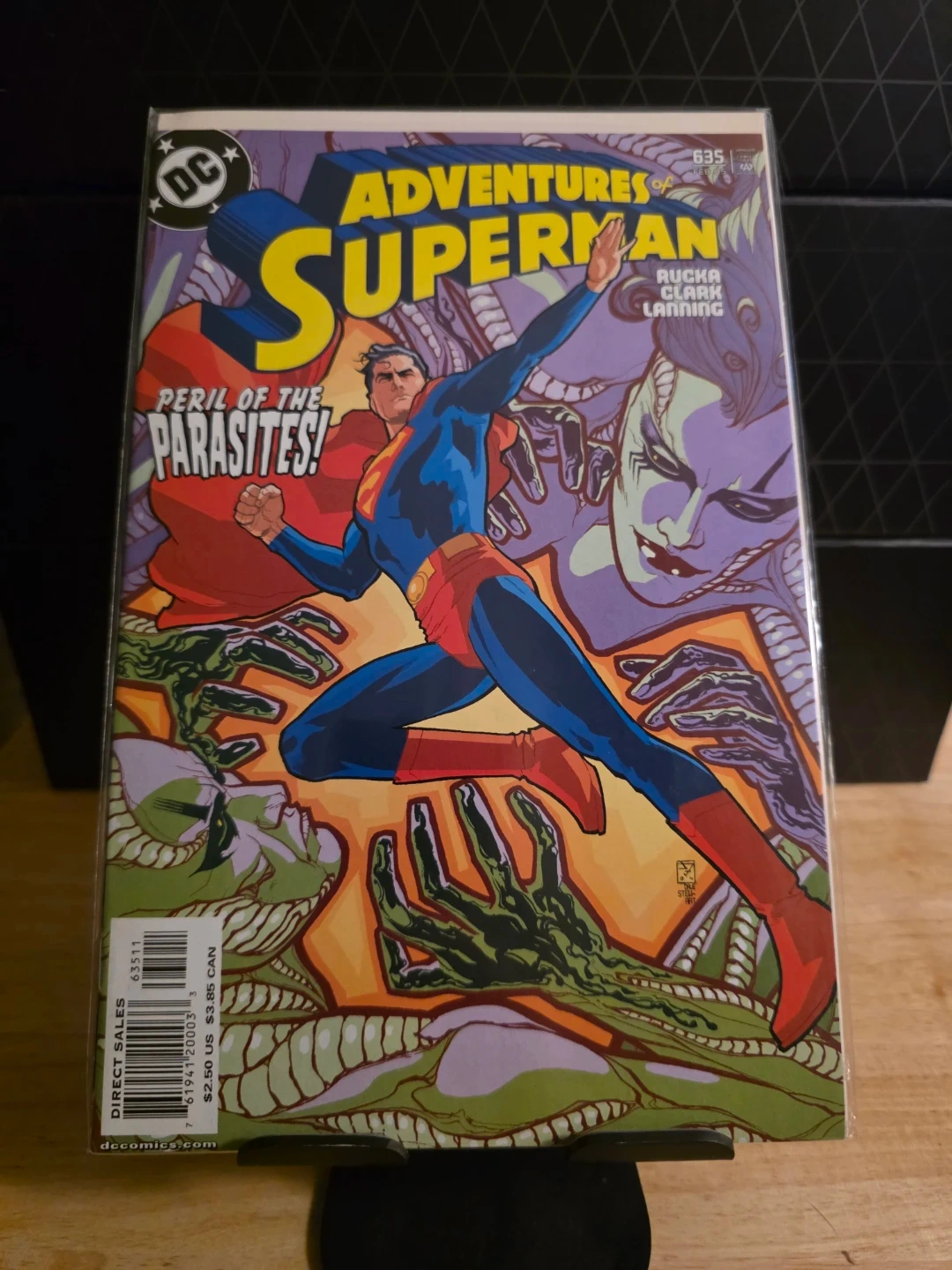 Selling a comic book titled Adventures of Superman. The cover says 'Peril of the Parasites!' It's issue #635. The original price was $2.50 US / $3.85 CAN