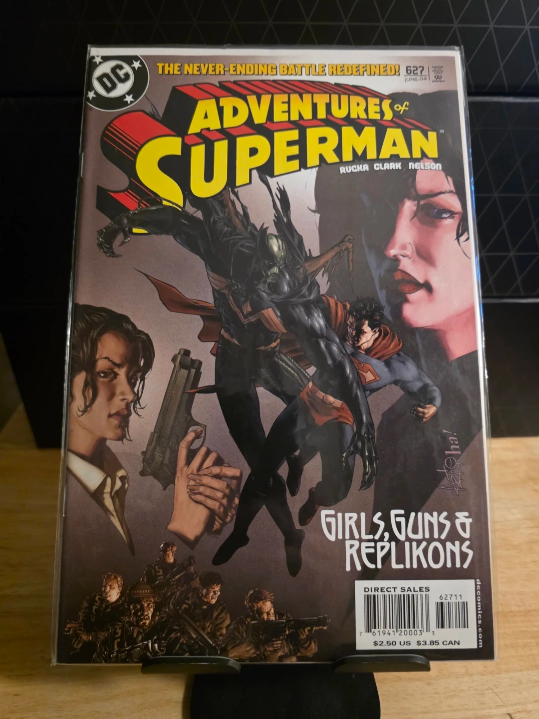 Selling a copy of Adventures of Superman #627. This comic book features the artwork of Rucka Clark Nelson and is issue number 627 from June 2004. The cover has a theme of 'Girls, Guns & Replikons'.