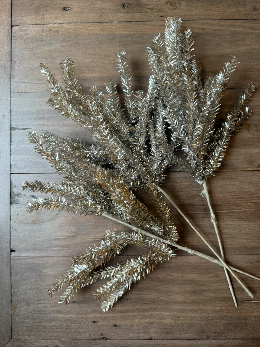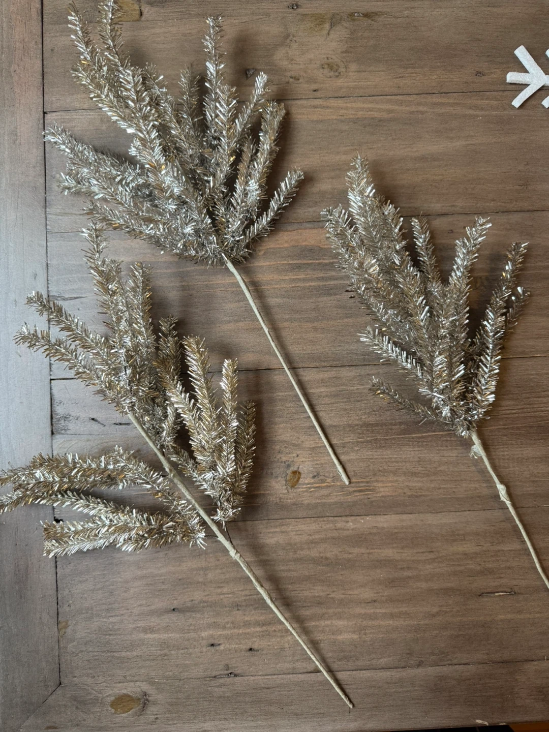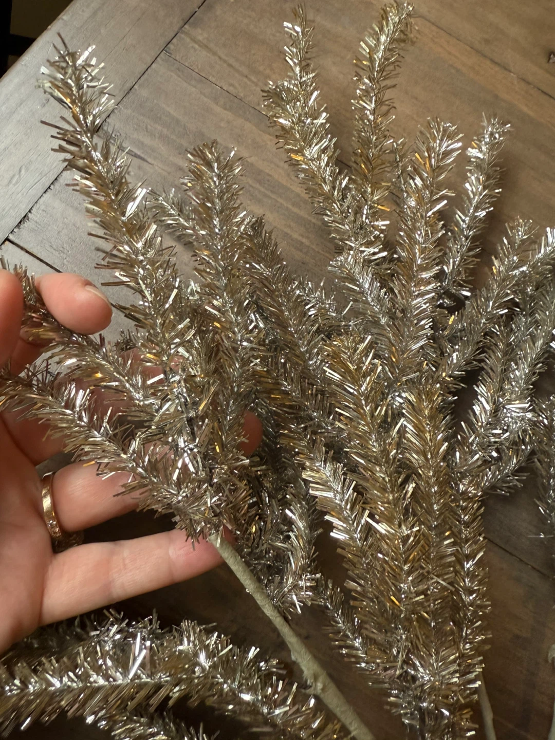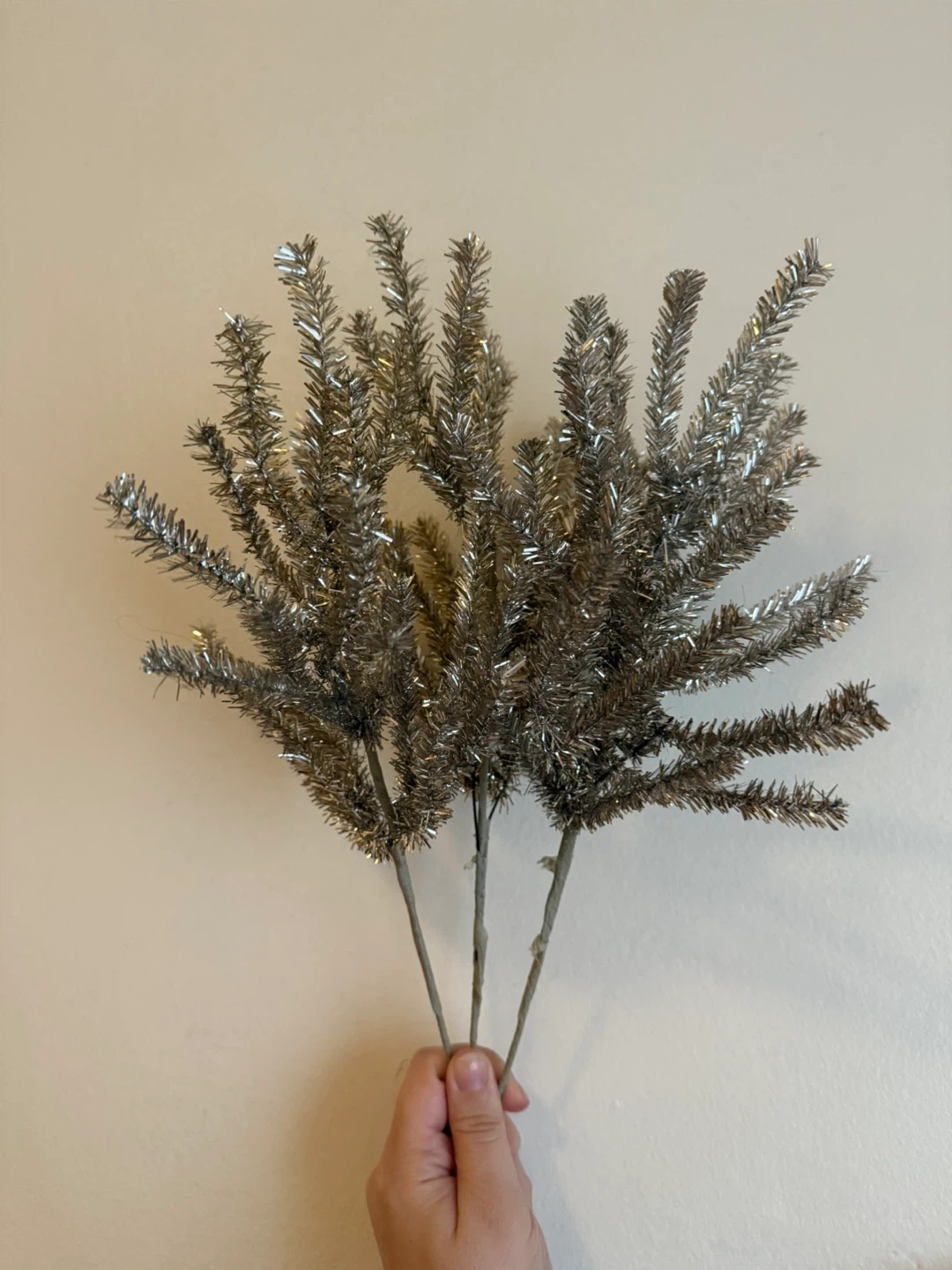 3 soft tinsel branch with wire springs to shape any way you like. Purchased from The Cross in Yaletown last season.