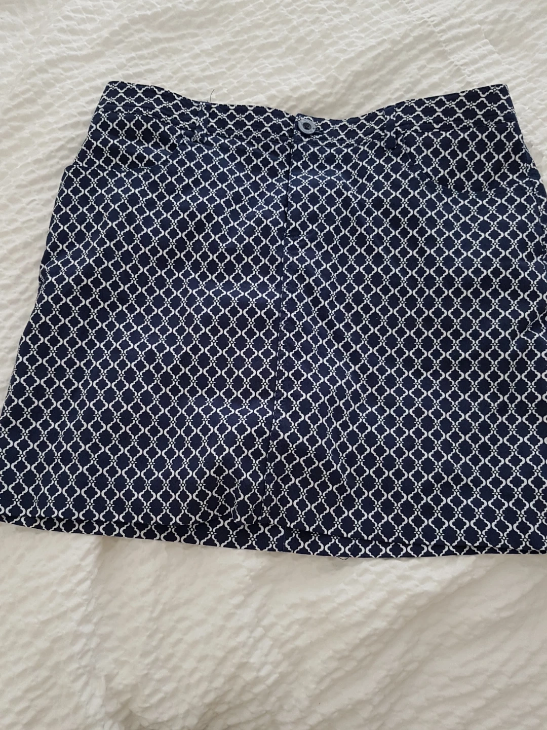 Here's a lovely Mario Serrani skirt in size M/M! It's a stylish navy blue with a white pattern. The material is 74% Viscose, 23% Nylon, and 3% Spandex/Elastane, with a 100% Polyester lining. Please also check out my other listings on this account. This is a no pet/ smoke home. Pick Up Cochrane, Alberta