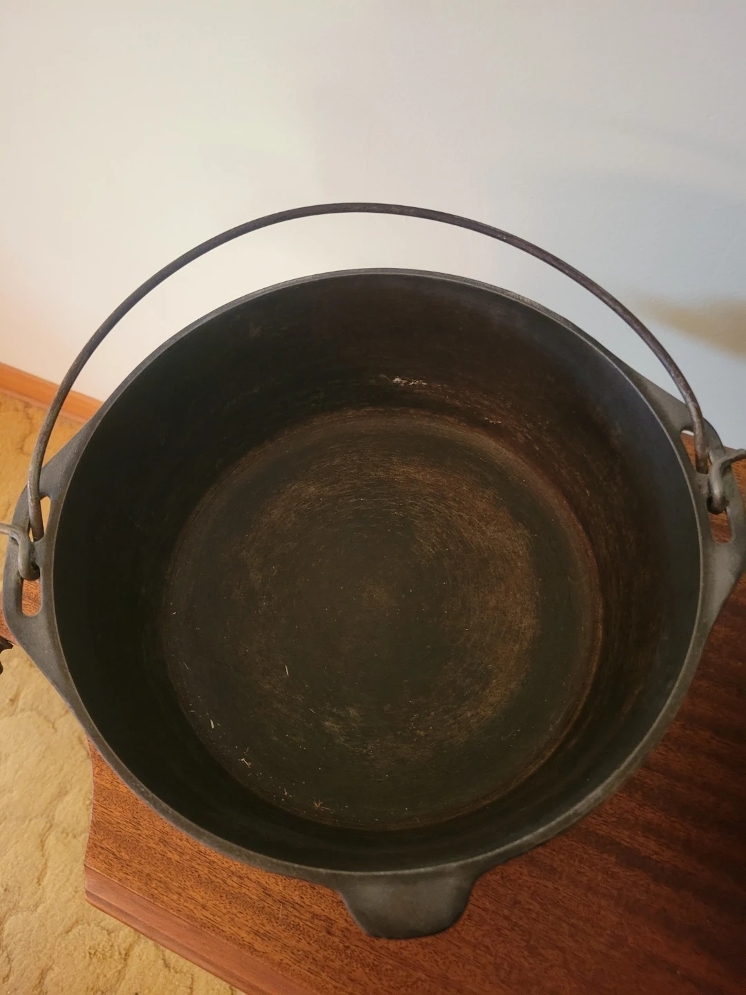 Selling a well-seasoned cast iron Dutch oven. It's perfect for cooking stews, roasts, and even baking bread. This pot is durable and retains heat evenly for delicious meals. It comes with a lid and a convenient carrying handle. It has some signs of use, but it is ready for your next culinary adventure!