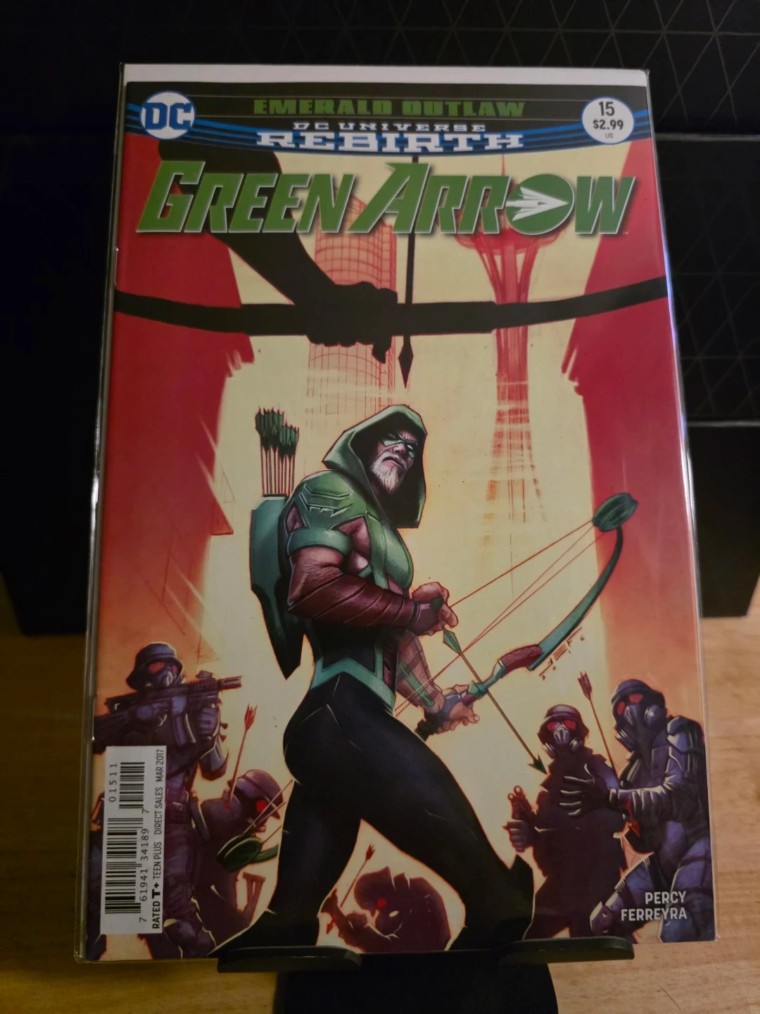 Selling a Green Arrow comic book, Emerald Outlaw from the DC Universe Rebirth series! Rated T+ for Teen Plus, it's issue #15. Direct sales from March 2017. The cover price was $2.99