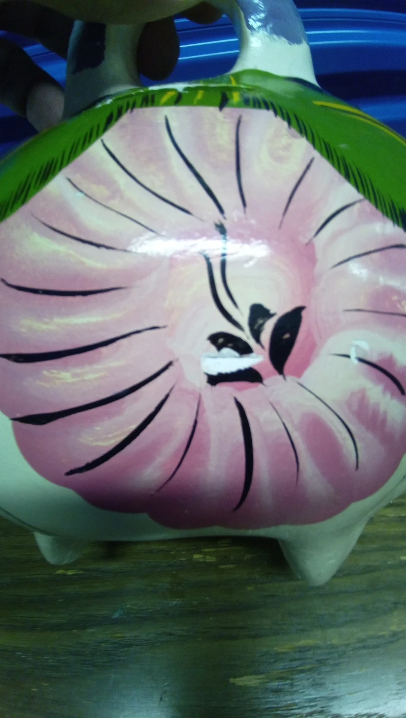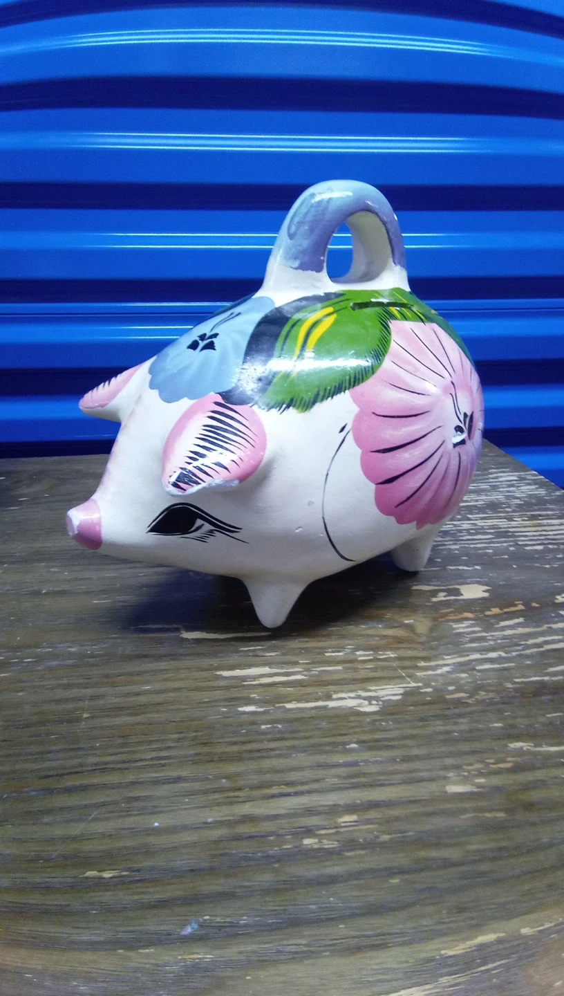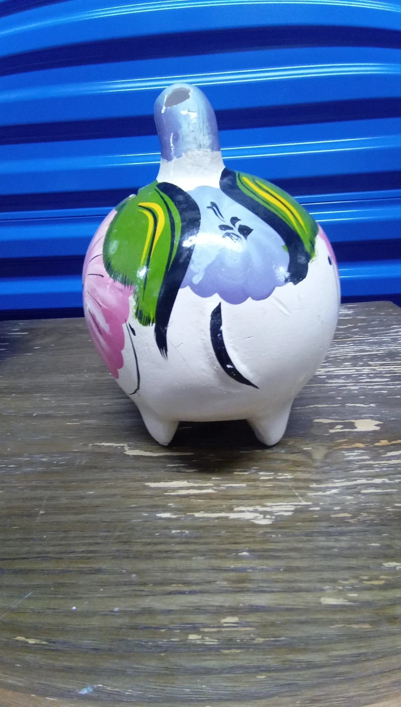 Selling a charming, hand-painted piggy bank! It has a unique design with colorful floral patterns. Perfect for adding a touch of whimsy to any room.