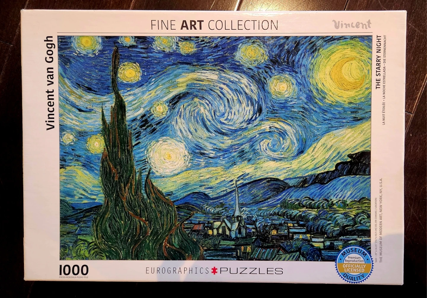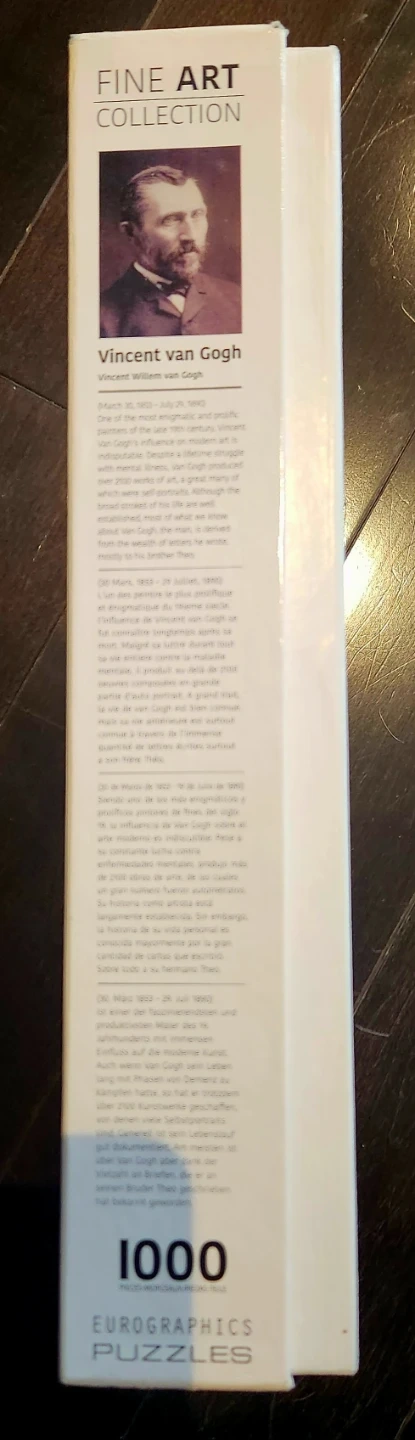 This Eurographics jigsaw puzzle features Vincent van Gogh's famous "The Starry Night" painting. It's a 1000-piece puzzle, officially licensed premium reproduction. The box includes the puzzle and is part of the Fine Art Collection. All pieces there. Assembled once.