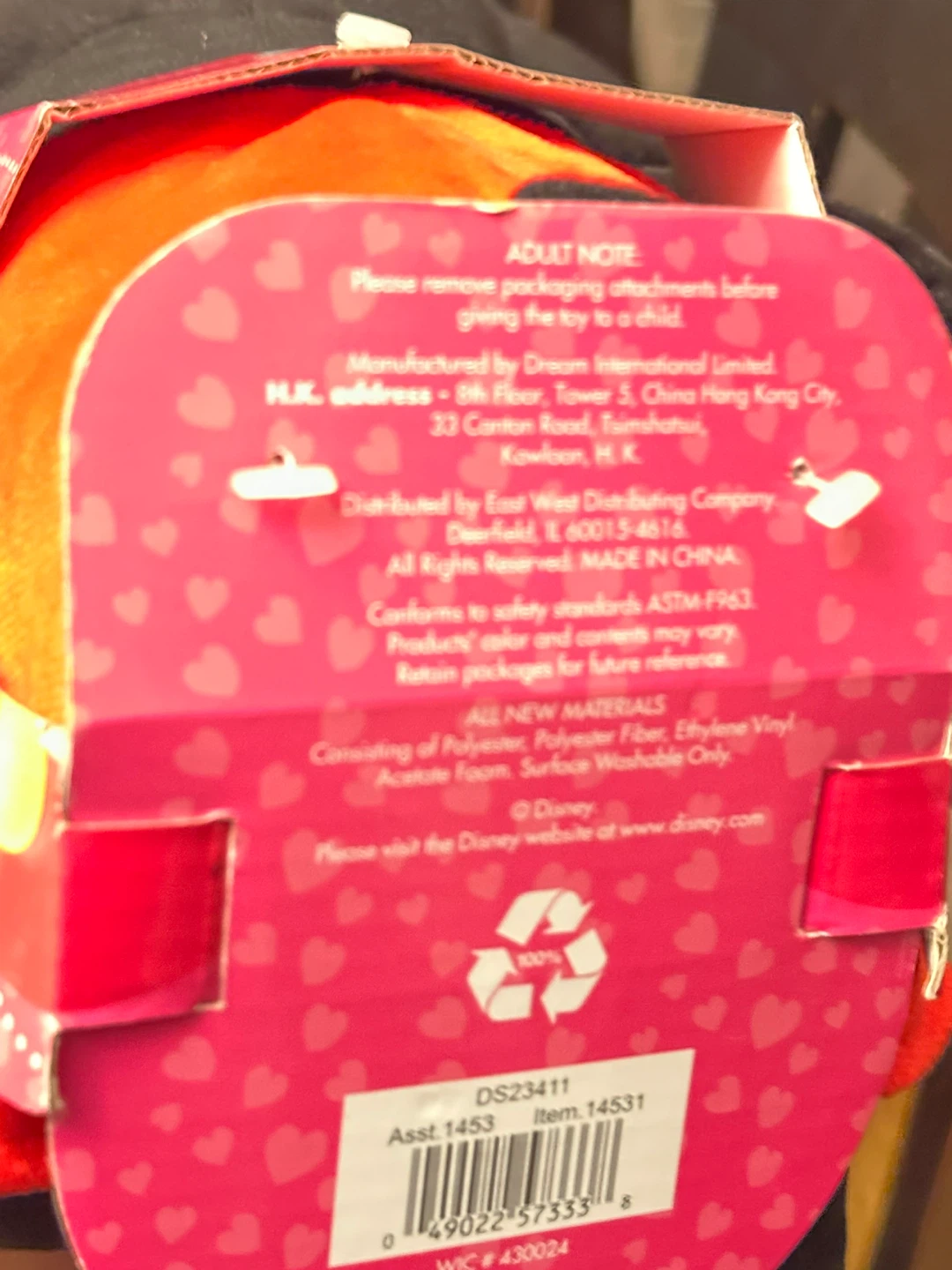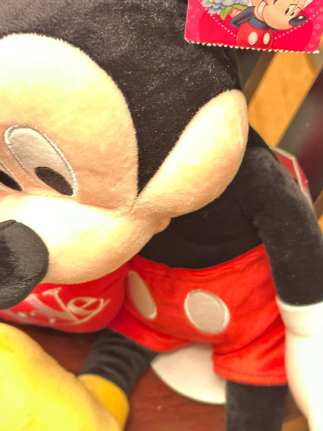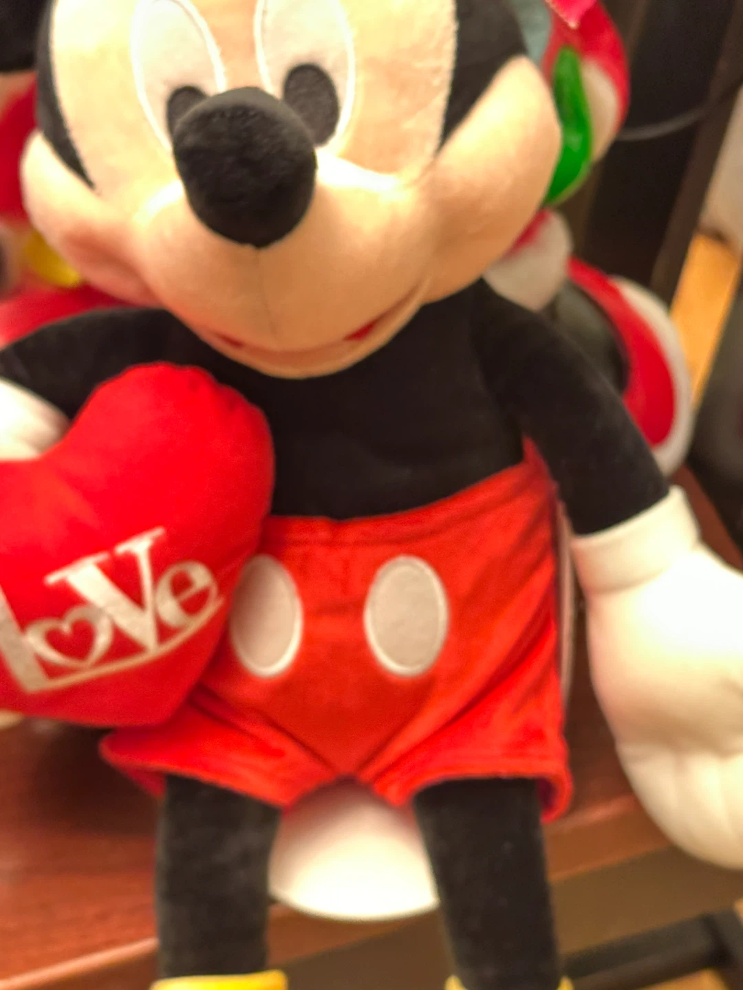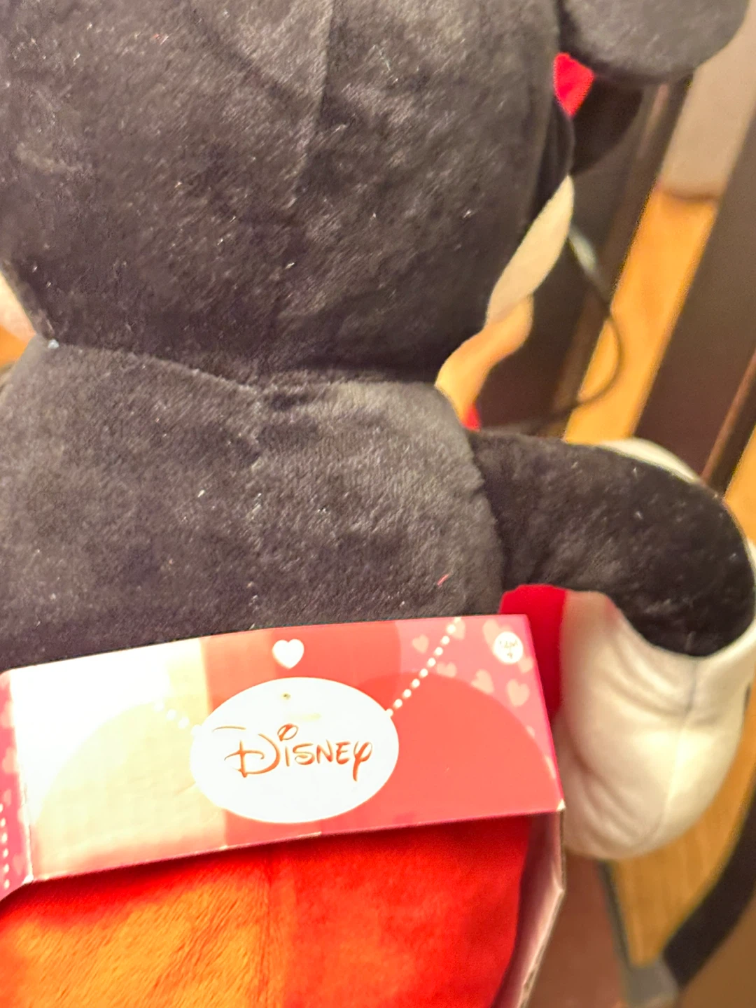 New with tags This is a cute Mickey Mouse plush toy holding a red heart with the word 'LOVE' on it! It's made of polyester fiber and ethylene vinyl acetate foam. It conforms to safety standards ASTM F963