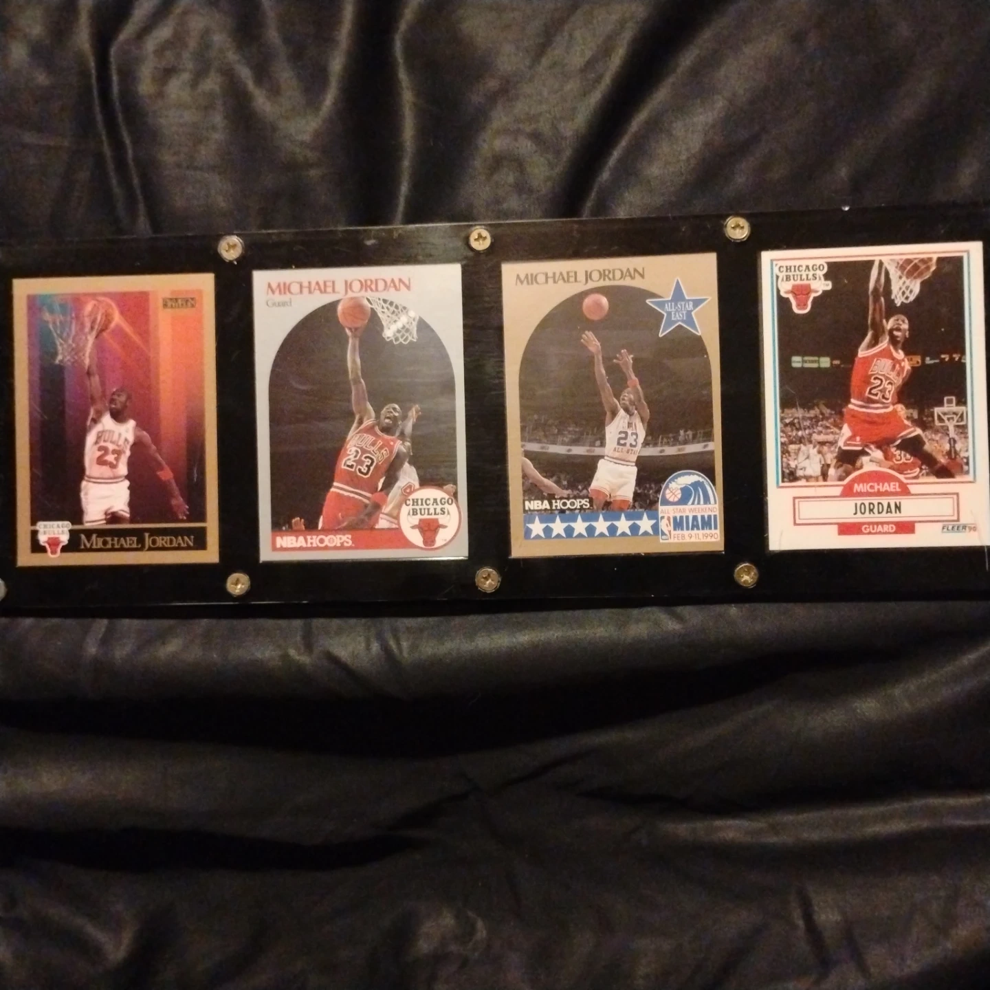 Selling a set of Michael Jordan trading cards, professionally displayed in a protective case! The cards feature various images of Michael Jordan during his NBA career with the Chicago Bulls, including action shots and all-star appearances. A great addition to any sports memorabilia collection.