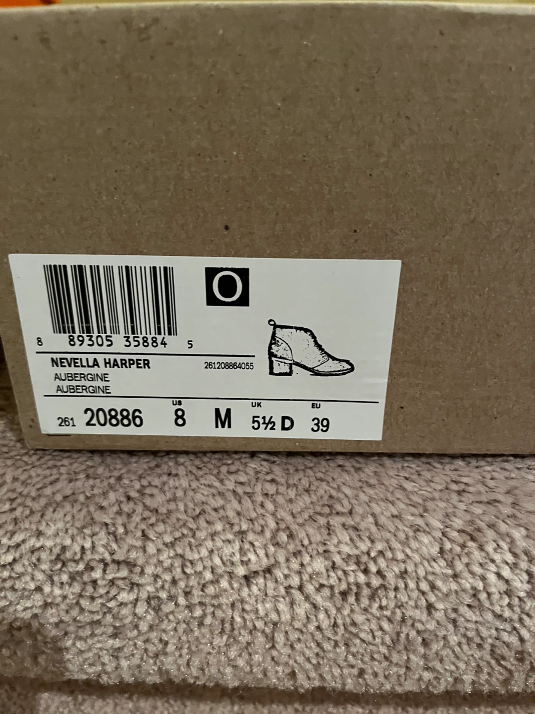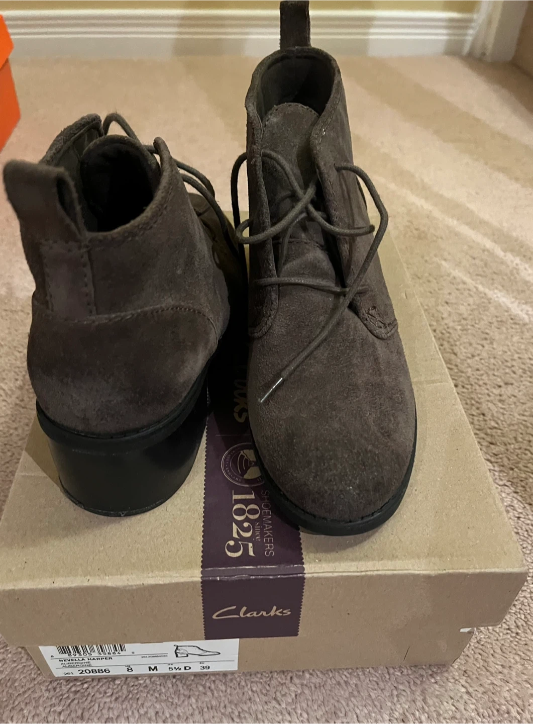 Selling a pair of Clarks Nevella Harper ankle boots in brown, size 8. They come with the original box. These stylish boots are perfect for adding a touch of elegance to your wardrobe!