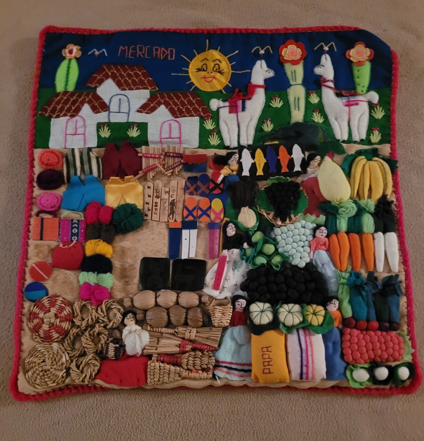 This is a unique, handmade wall hanging featuring a colourful mercado scene. It's perfect for adding a touch of folk art to any room. The piece is in good condition and ready to be displayed!