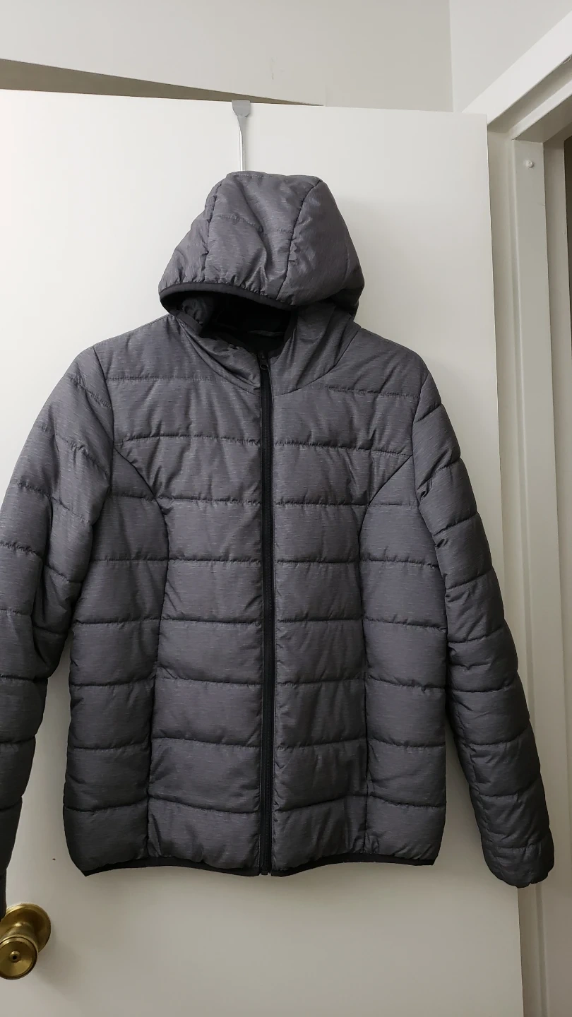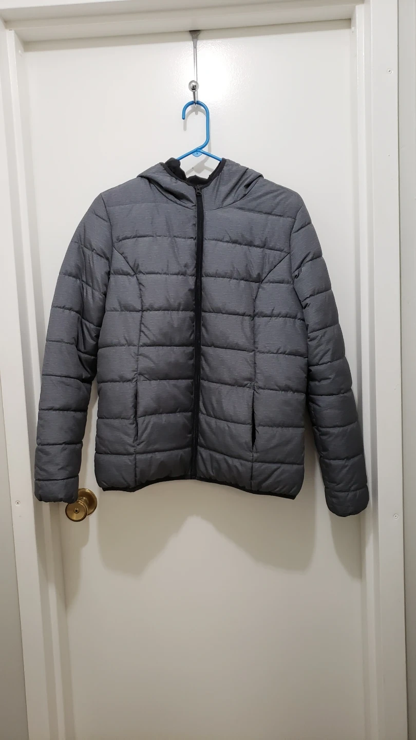 Ladies coat with hood, Light grey color, maybe worn twice so it's in excellent condition. Stylish, light weight, water resistant and comfy to wear.