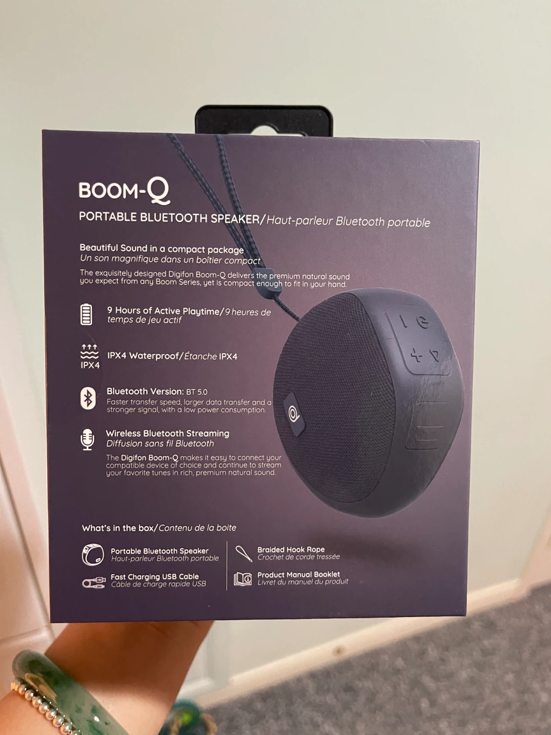 I have a brand new Digifon BOOM-Q portable Bluetooth speaker for sale! It delivers premium, quality natural sound with superb dynamic range. The rechargeable battery supports 9 hours of active playtime. What's in the box: - Portable Bluetooth Speaker - Fast Charging USB Cable - Braided Hook Rope - Product Manual Booklet
