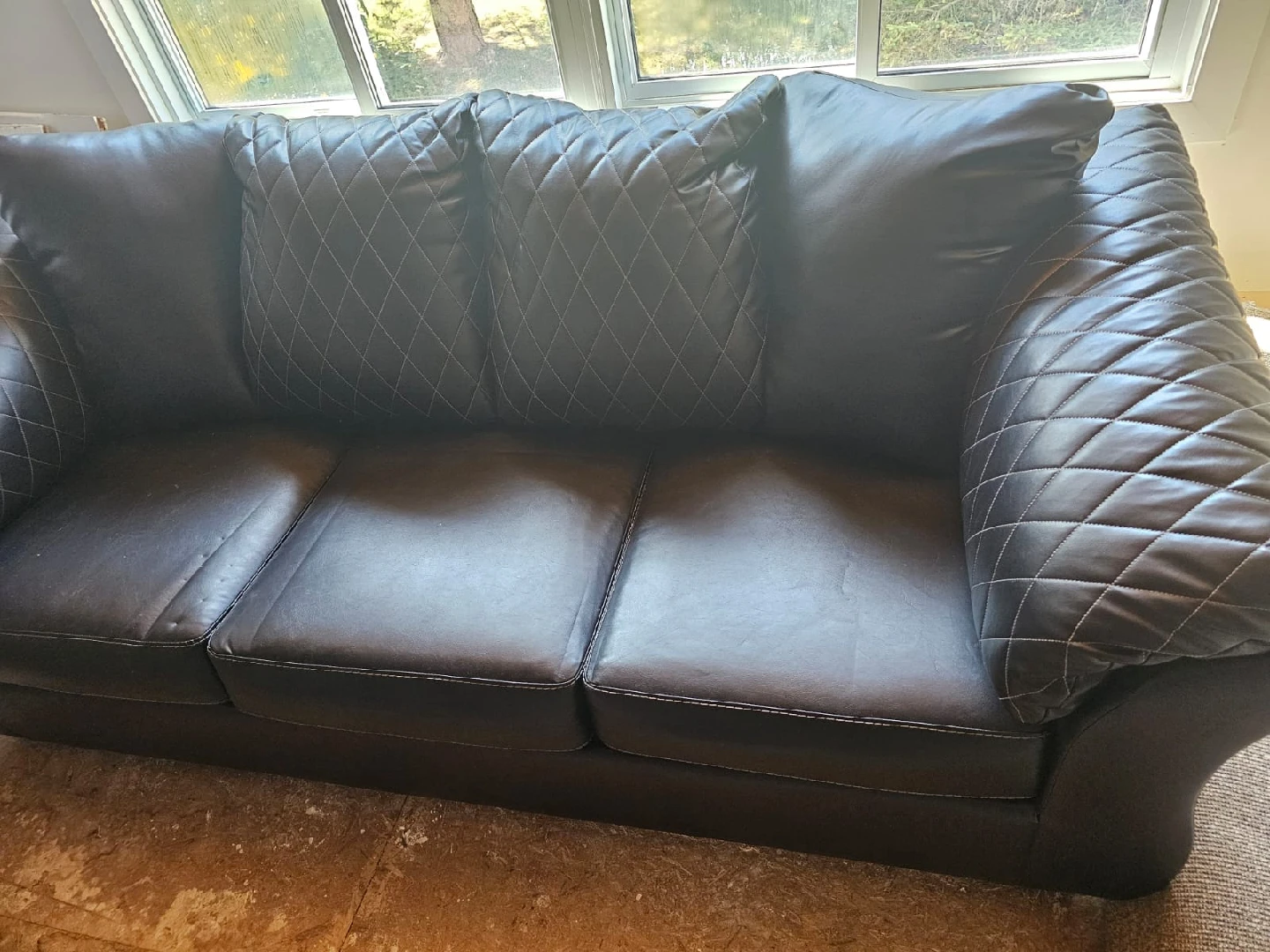 Selling a comfy black leather sofa! It's in great condition and would be perfect for a living room or den. The sofa features a quilted design on the cushions and backrests, adding a touch of elegance to its overall look