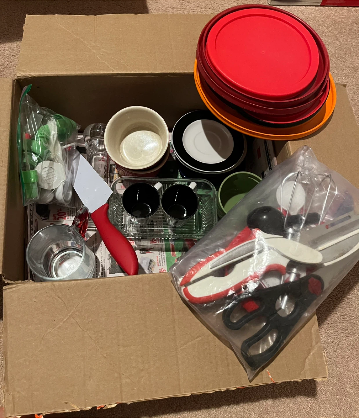 Selling a box of mixed kitchenware! Includes plates, mugs, glasses, utensils, and other kitchen essentials. Great for someone setting up a new kitchen or looking to add to their collection
