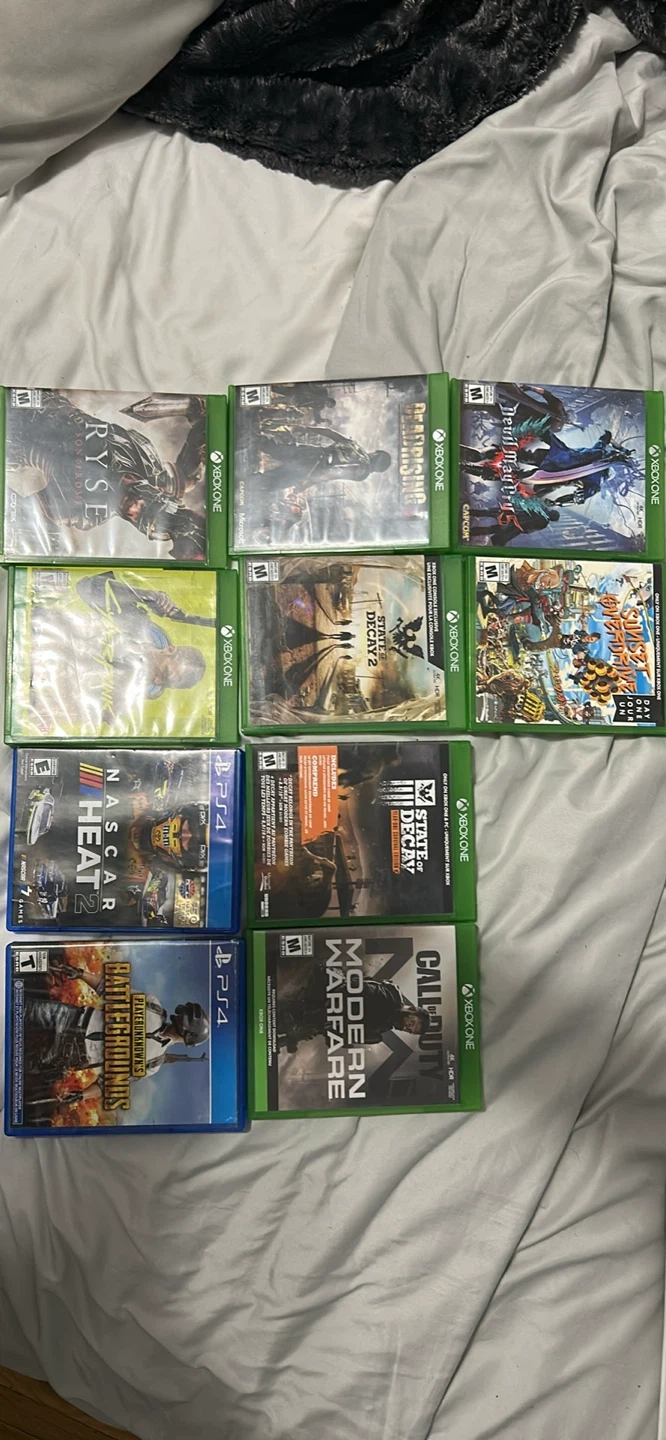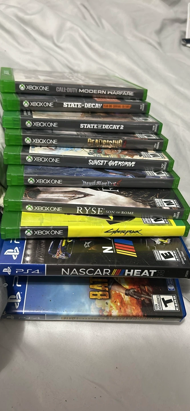 Selling a bundle of used games for Xbox One and PS4. Includes titles like Call of Duty: Modern Warfare, State of Decay 2, Dead Rising 4, Sunset Overdrive, Devil May Cry, Ryse: Son of Rome, Cyberpunk 2077, NASCAR Heat 2 Great for expanding your game collection!