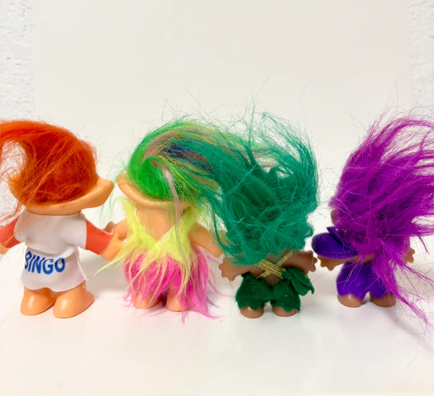 Selling a set of four vintage troll dolls! They each have unique outfits and colourful hair. Perfect for collectors or anyone who loves a bit of nostalgia
