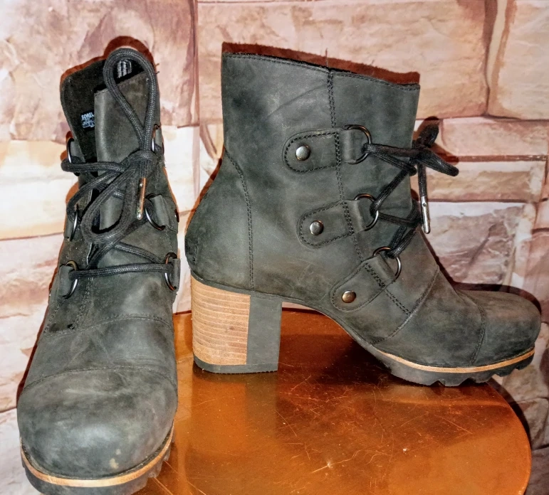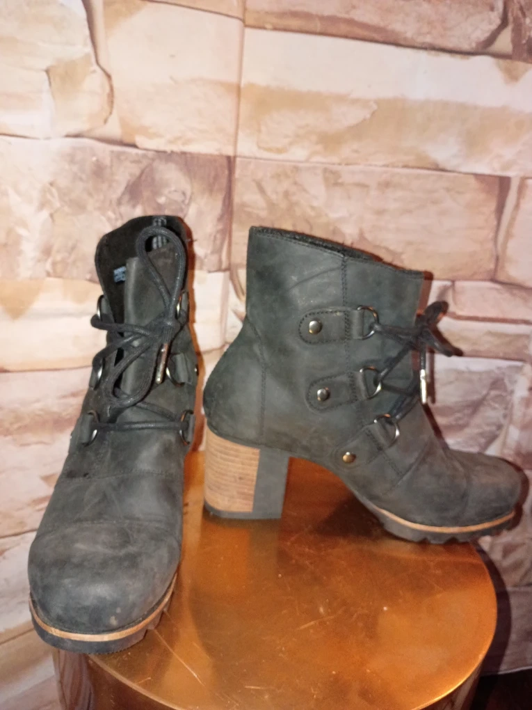 These are a cute pair of Sorel black nubuck leather heeled ankle boots! They feature a lace-up design with a block heel. Perfect for adding a bit of edge to any outfit! Sz 9