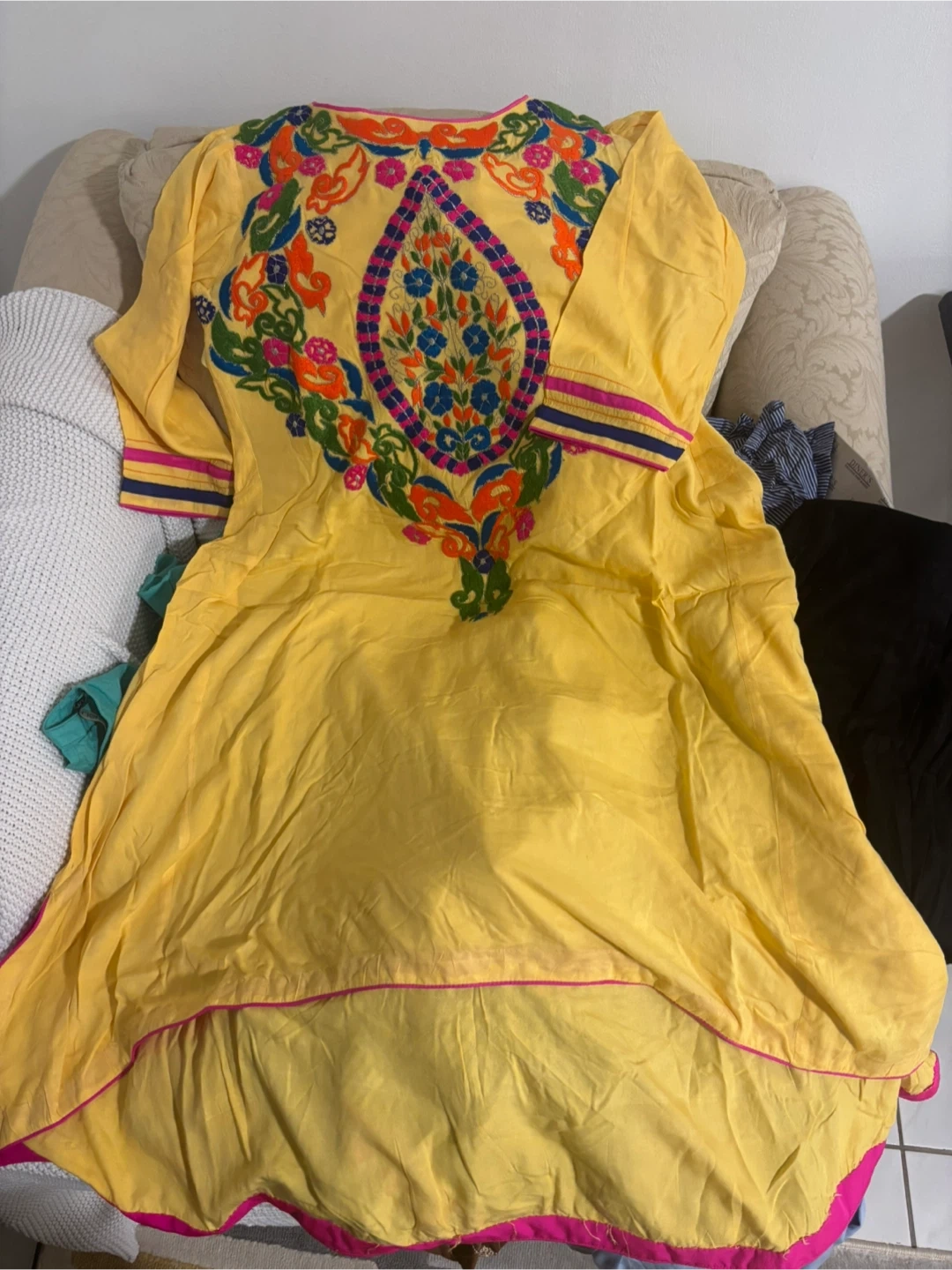 Selling a lovely yellow linen kurti dress with beautiful embroidery! It's in great condition and ready for a new home. The vibrant colours and unique design make it a standout piece for any wardrobe. Perfect for adding a pop of colour to your day!
