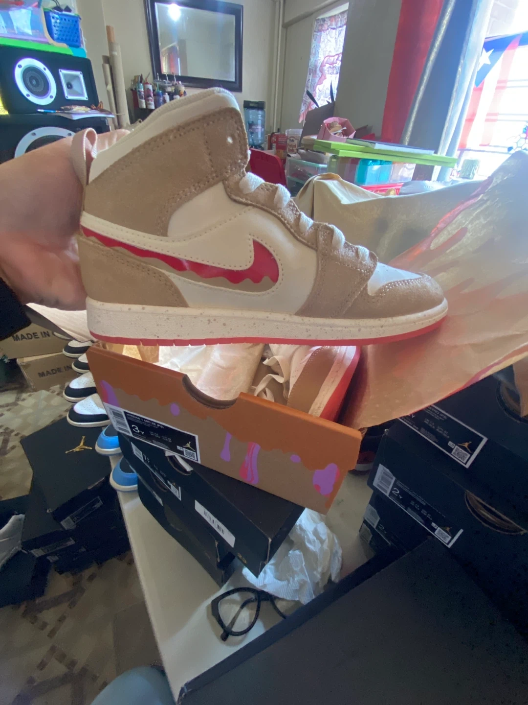 Selling a pair of Nike Air Jordan 1 Mid SE Paint Drip shoes in size 3Y. The shoes come with the original box