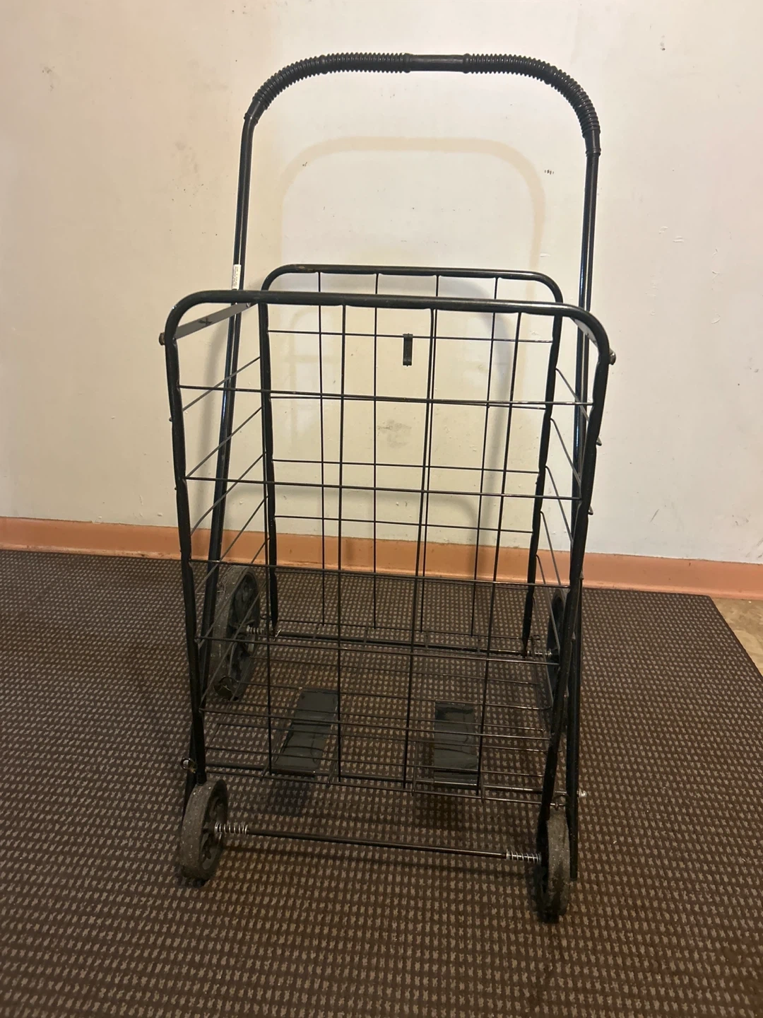 Selling a black folding shopping cart. It's in good condition and ready to help with your grocery runs or trips to the farmers market. It's lightweight and easy to store, making it a convenient choice for anyone who needs a little extra help carrying items