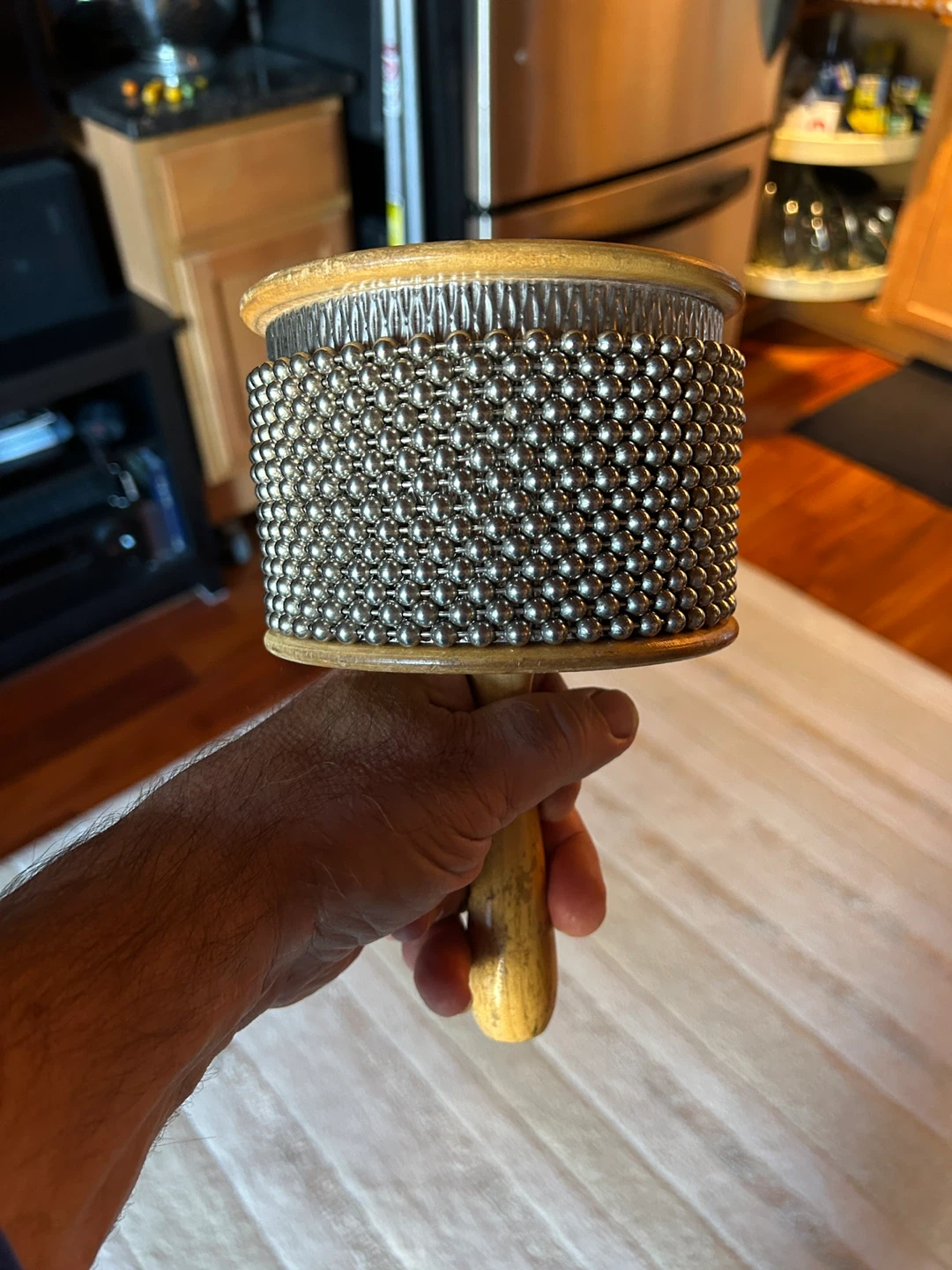 Selling a vintage LP Latin Percussion Afuche Cabasa. It's in good condition and ready to make some music. 5-1/4” diameter, 3-3/4” tall cylinder, 13 rows of beads.
