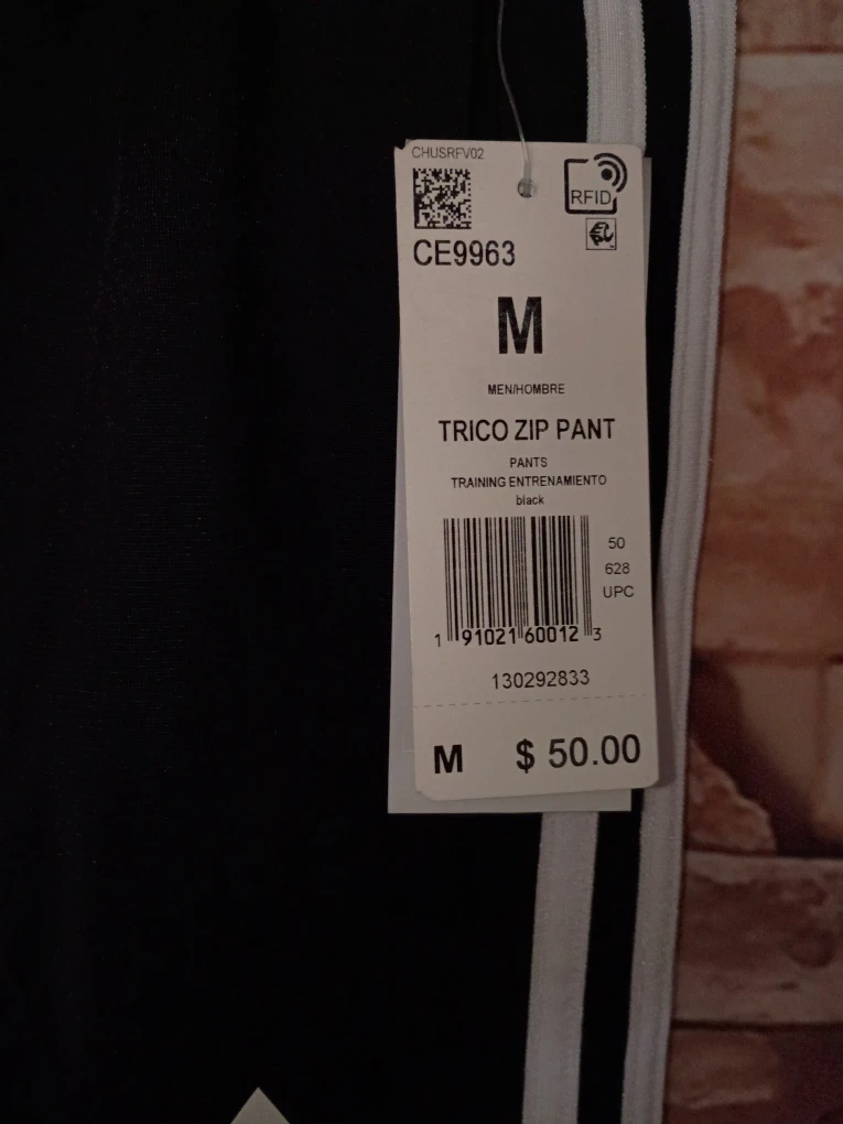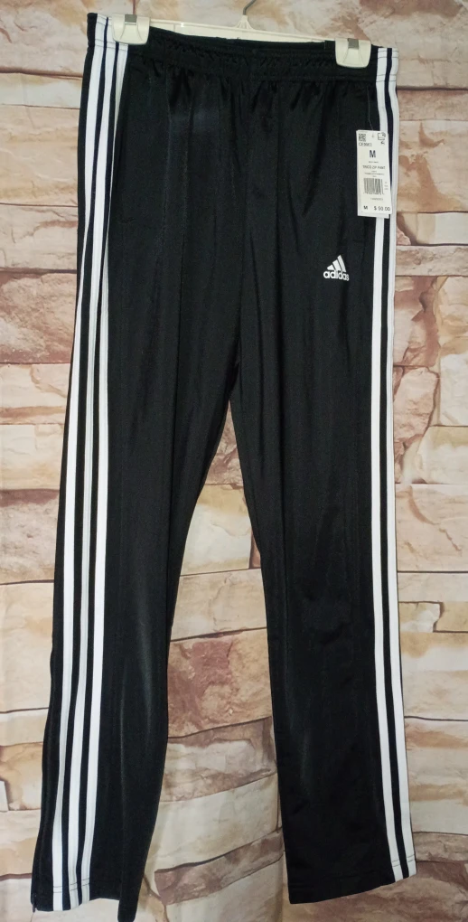 Selling a pair of Adidas Trico Zip Pants in black. These are a size medium and feature the classic three-stripe design. The original tag shows a price of $50. Great for training or just lounging around!