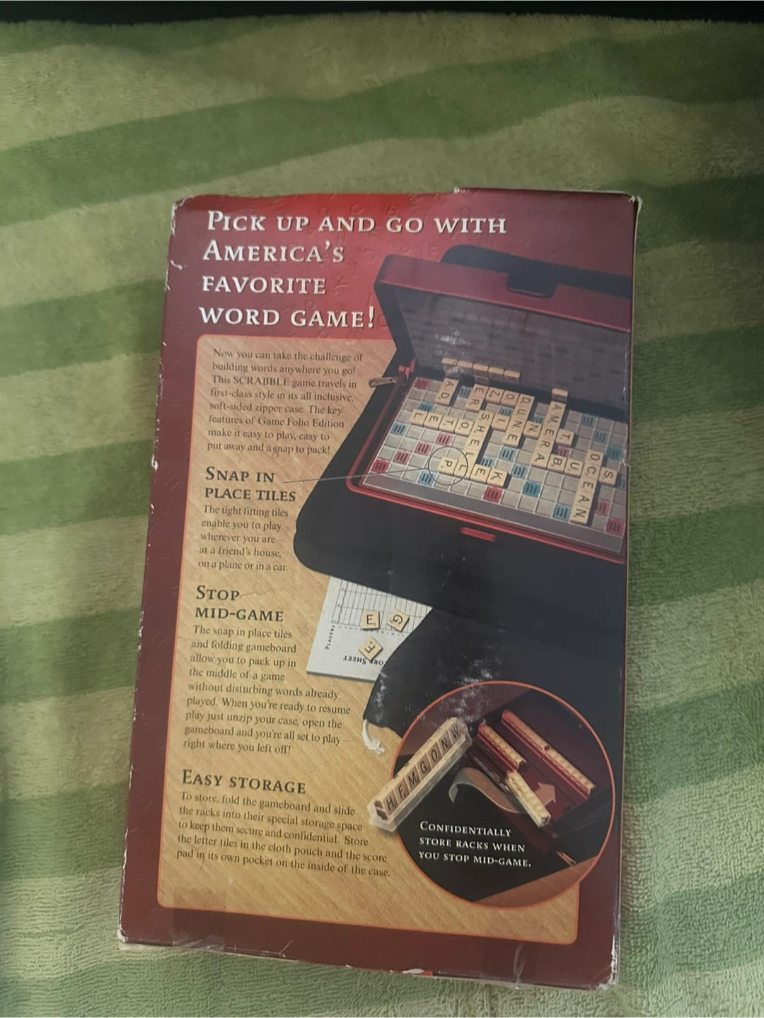 Scrabble Game, Folio Edition by Parker Brothers! It's a crossword game that's perfect to take anywhere. It features snap-in-place tiles, a stop mid-game function, and easy storage. Ages 8 to adult, 2 to 4 players