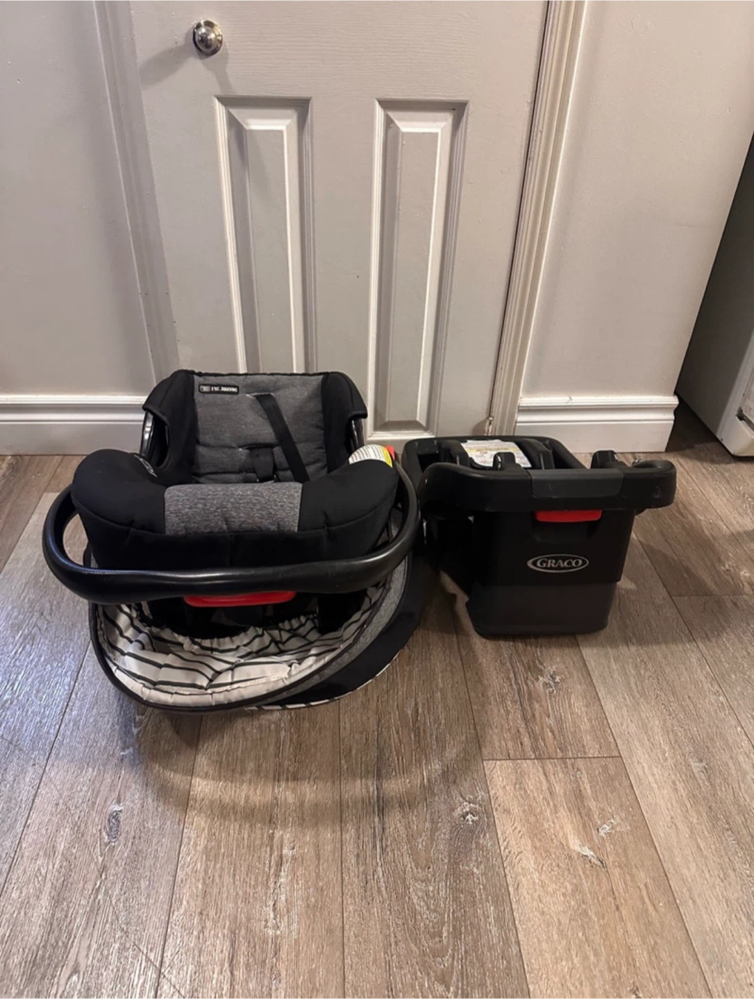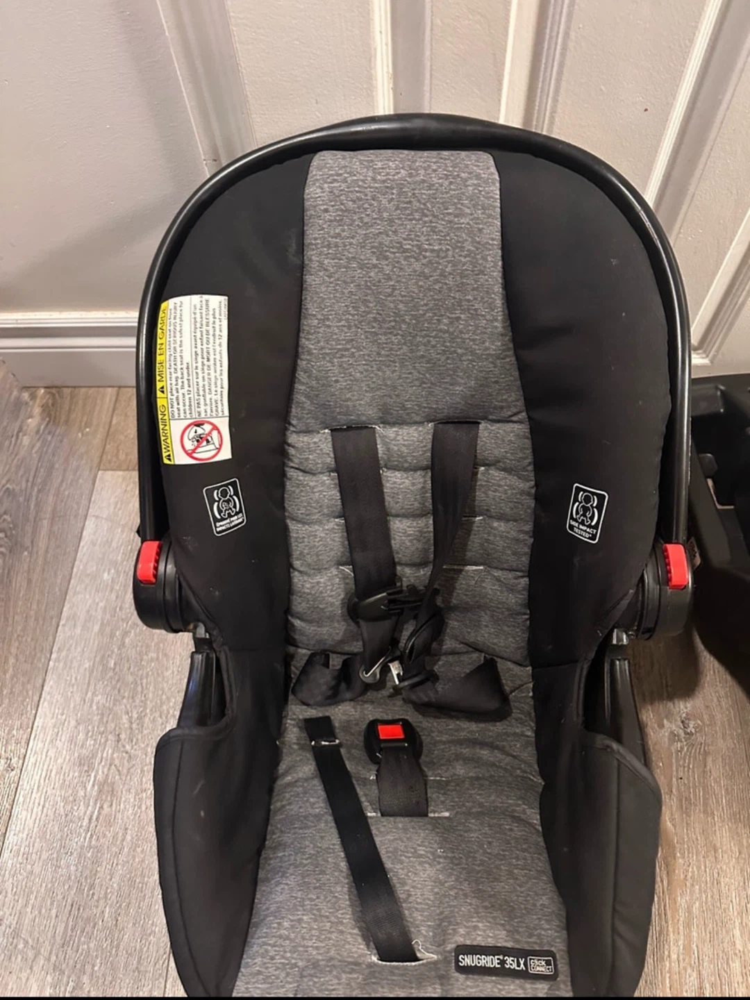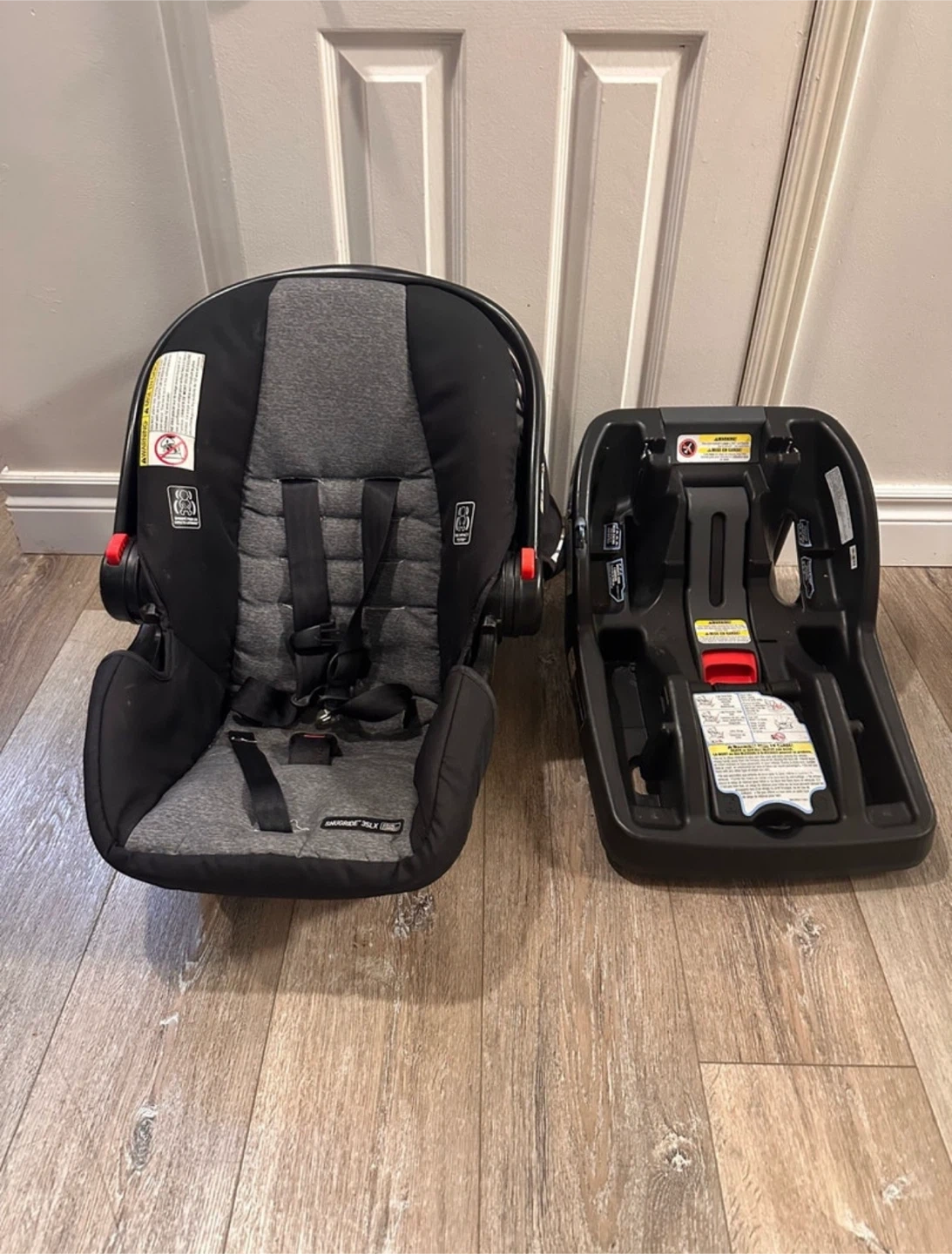 Selling a gently used Graco SnugRide 35LX infant car seat in black and grey. It's in good condition and comes with the base. The manufacturing date is 2019 April 24. Perfect for your little one!