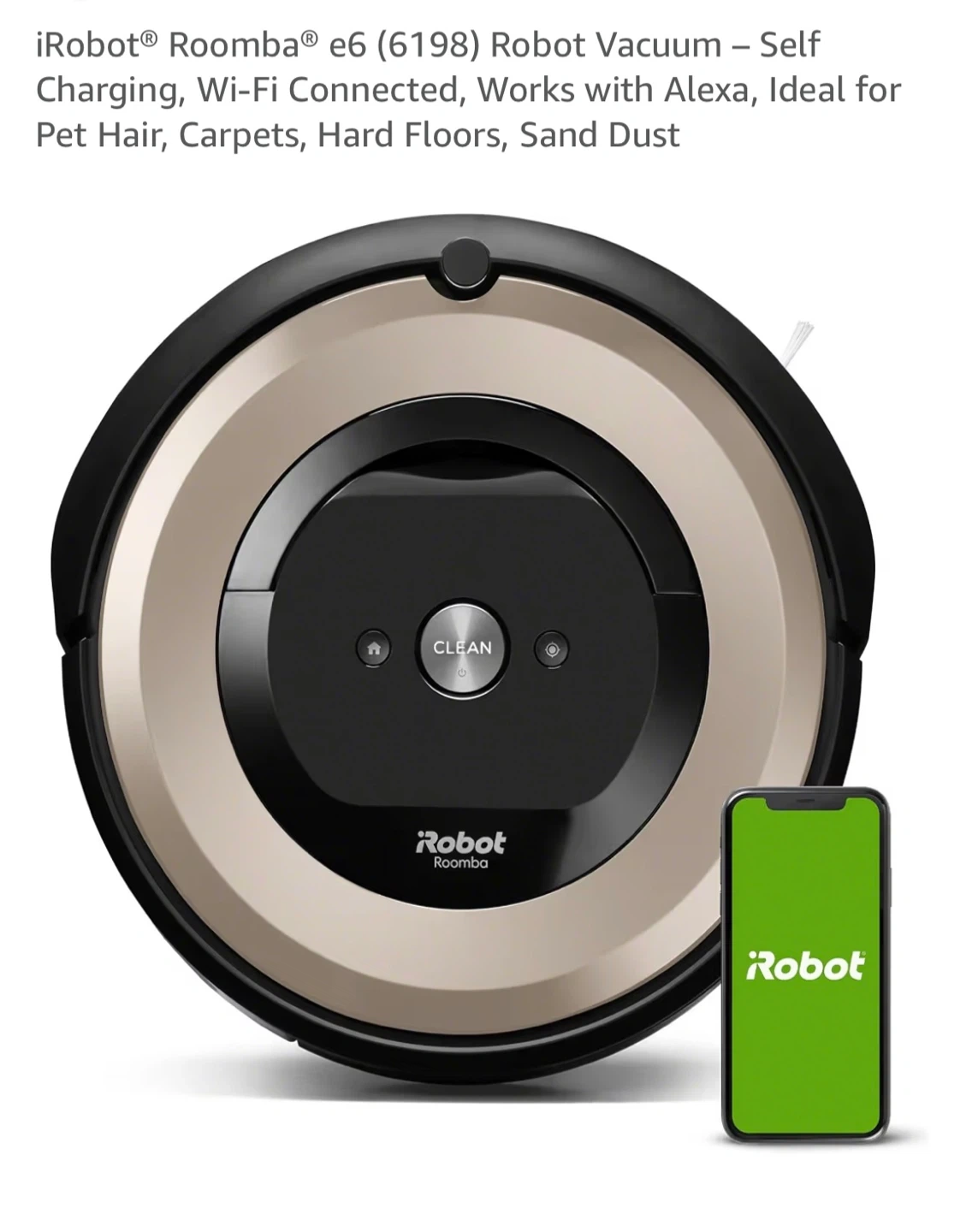 Selling an iRobot Roomba e6 (6198) Robot Vacuum! It's self-charging and Wi-Fi connected. This vacuum works with Alexa and is ideal for pet hair, carpets, hard floors, and even sand and dust. Keep your home clean with this handy robot!