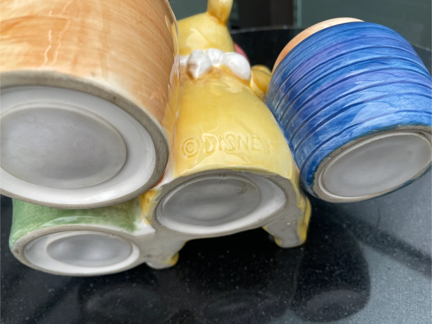 This is a vintage Disney Winnie the Pooh coin bank! It features Pooh bear hugging honey pots, each with a slot for coins. A cute and nostalgic piece for any Disney collector. 5.5” tall. One small chip on the red honey pot that you can only see from the back.
