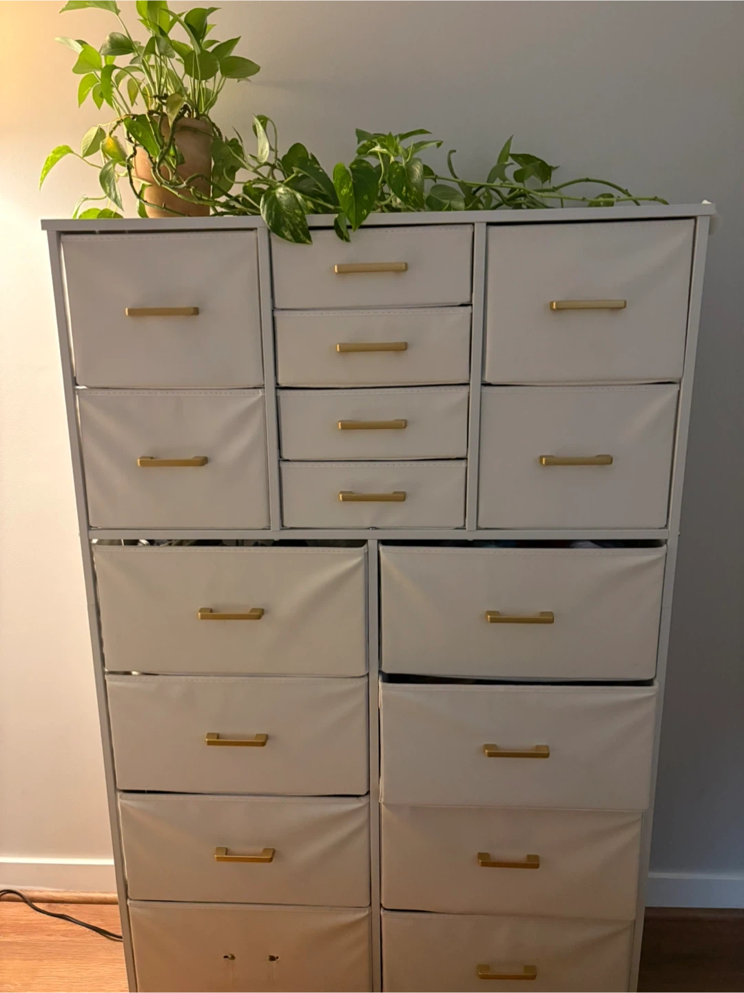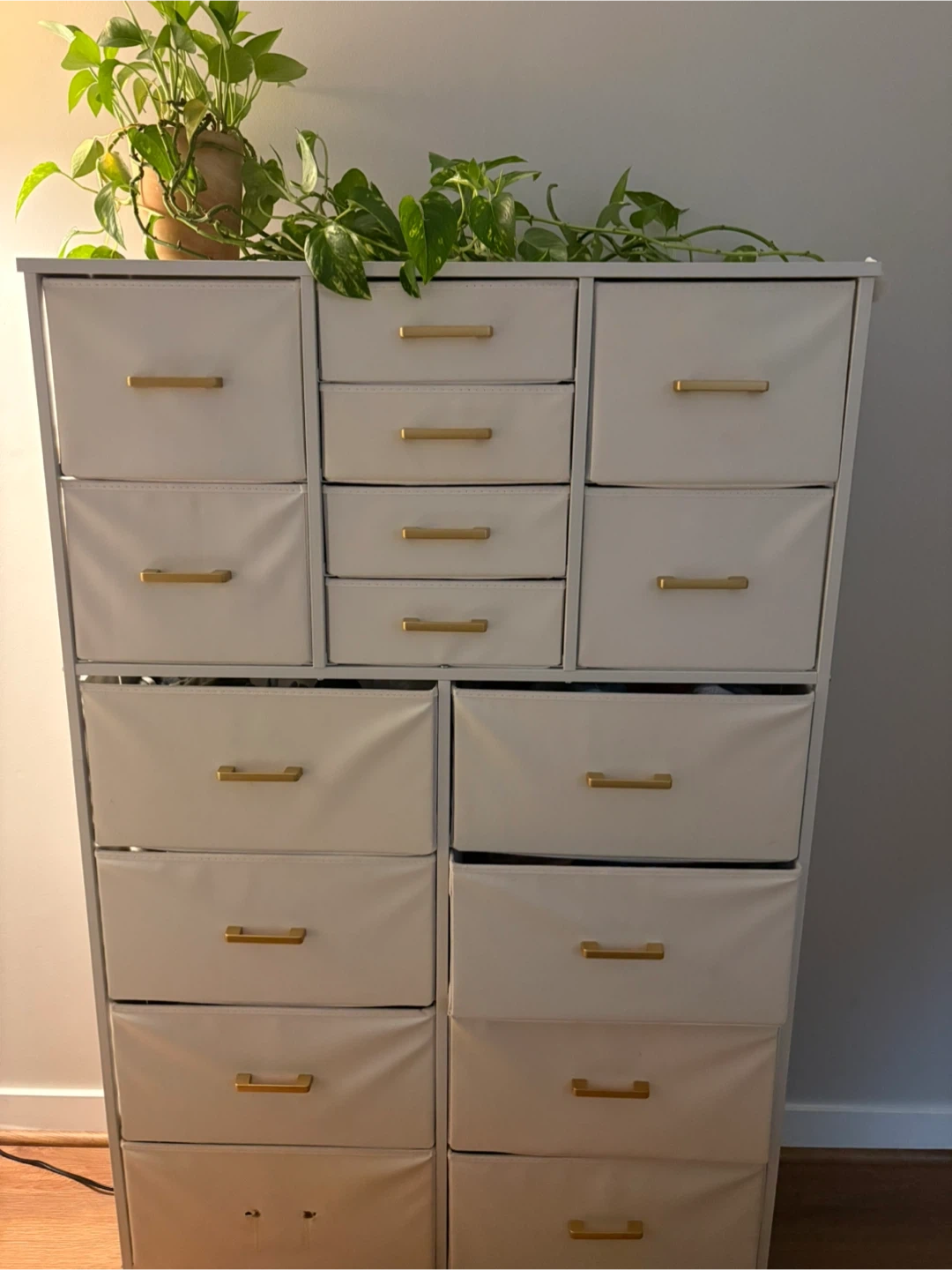 Here's a white storage cabinet with 15 drawers! It's perfect for organizing clothes, accessories, or anything else you need to store. The drawers have gold handles. One is missing on the lower left but that is the only damage. Prize negotiable.
