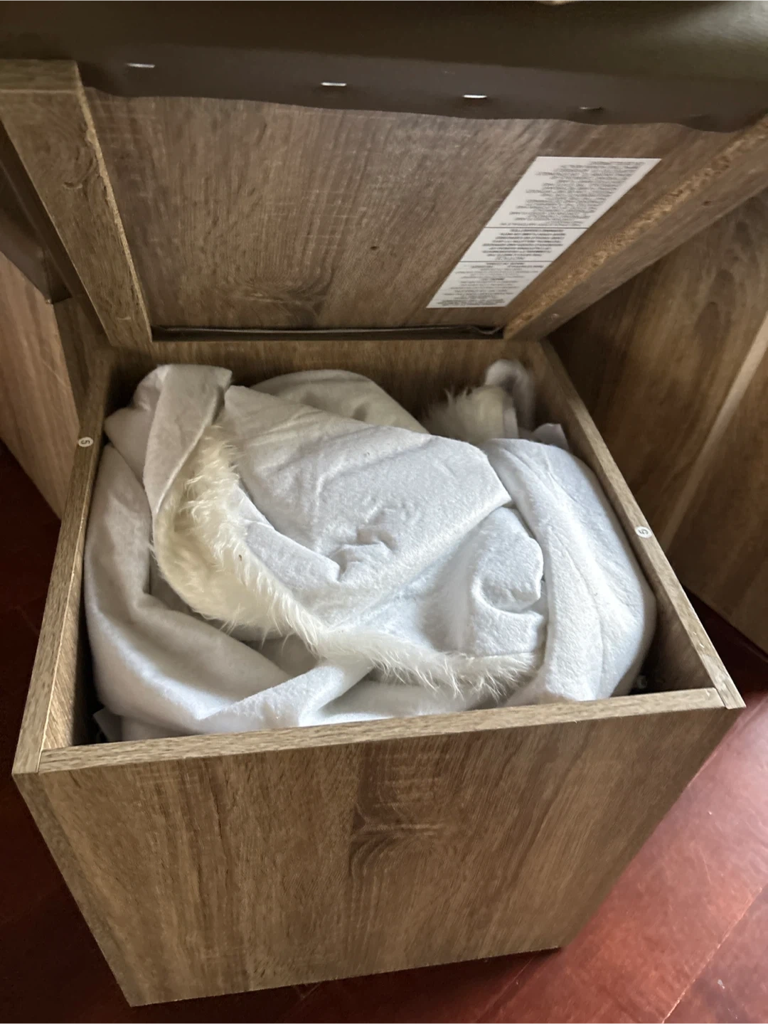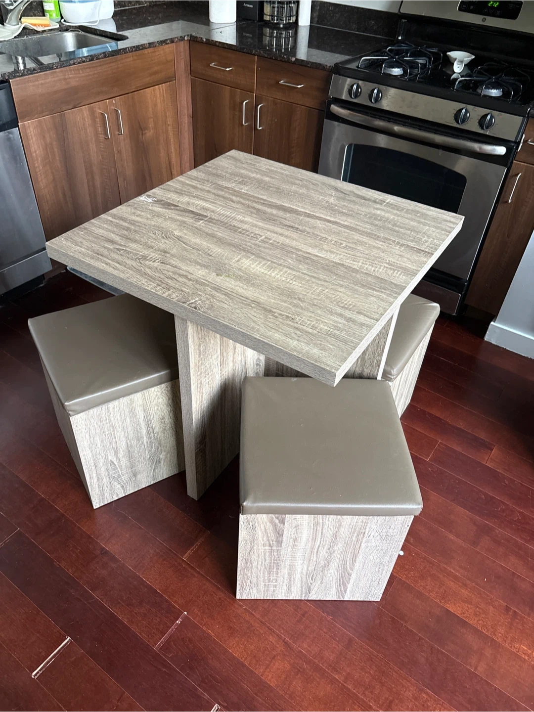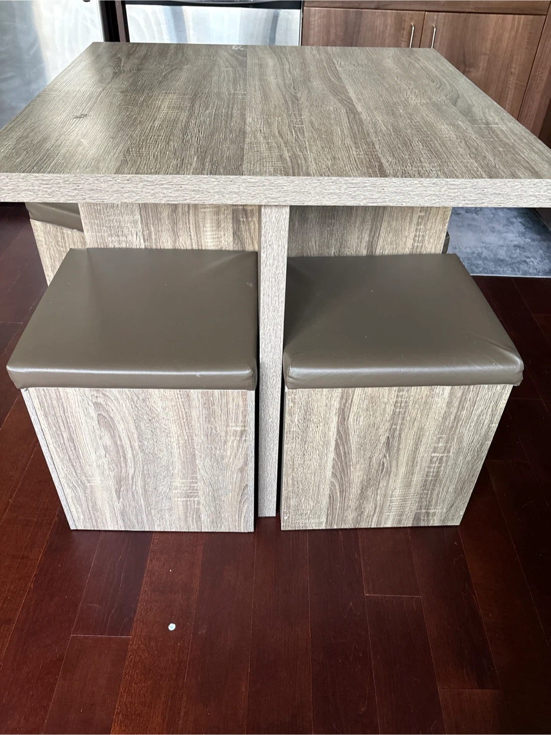 I'm selling a dining table that comes with four stools that can be stored underneath. It's a great space saver! The stools have a faux leather top and the table and stools are a light wood color. Perfect for a small apartment or breakfast nook