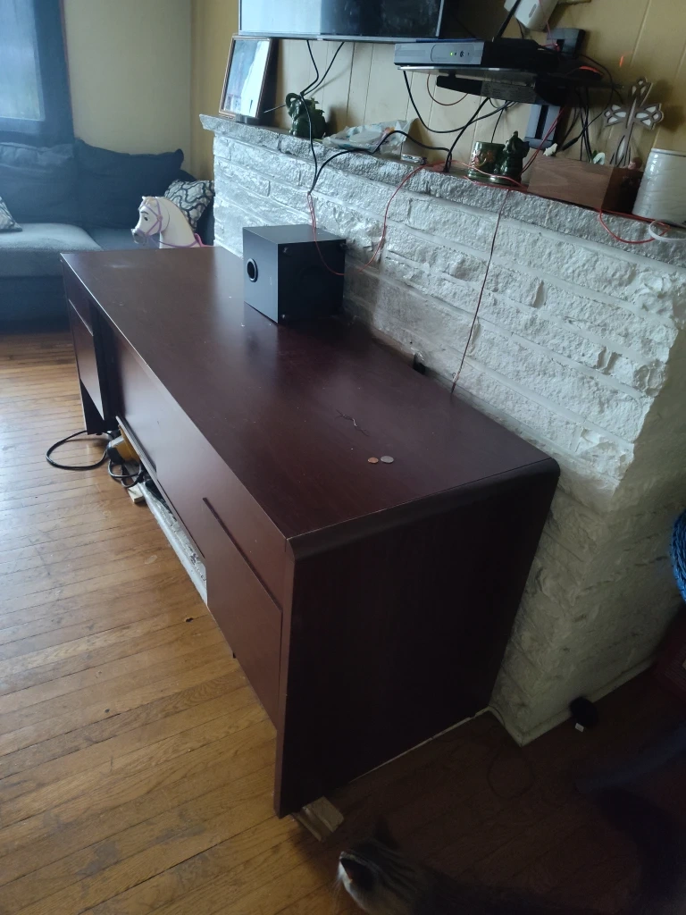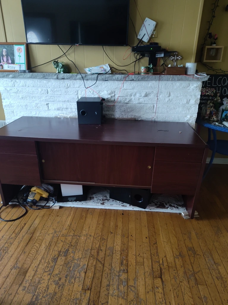 This wooden desk features a rich, dark finish and offers ample storage space with drawers and a cabinet. It's sturdy and has a classic design that would look great in a home office or study. Perfect if you need a reliable workspace!