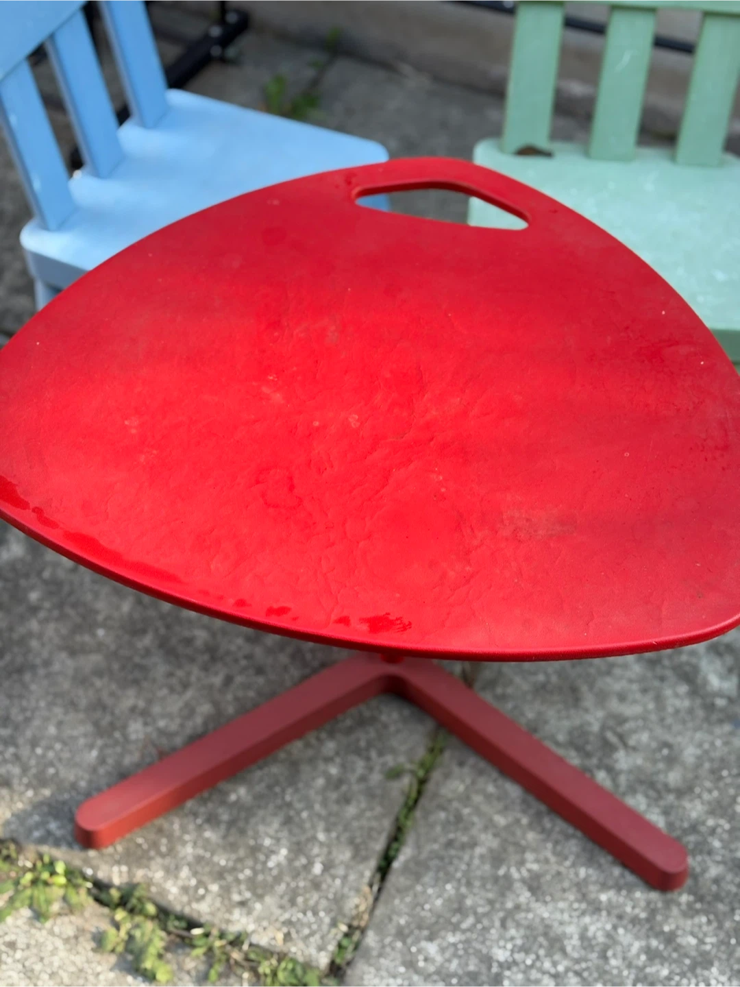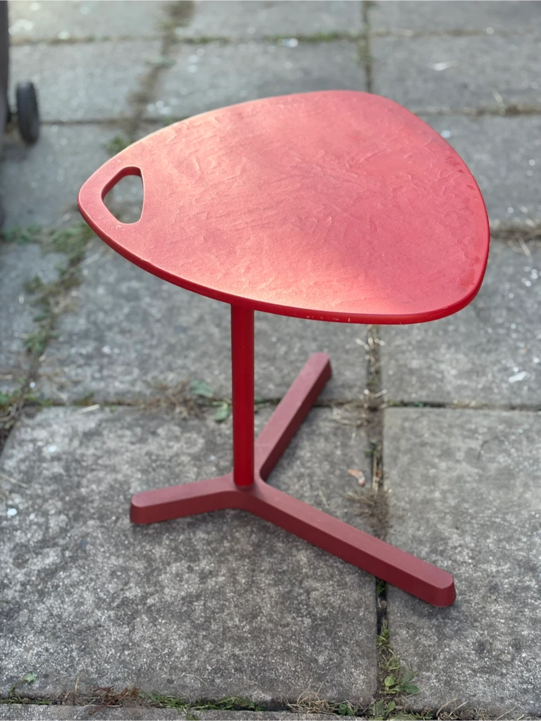 A unique red side table with a distinctive triangular design and a convenient handle. Perfect for adding a pop of colour to your space! It has a sturdy base and is in great condition, ready to be a stylish addition to your home