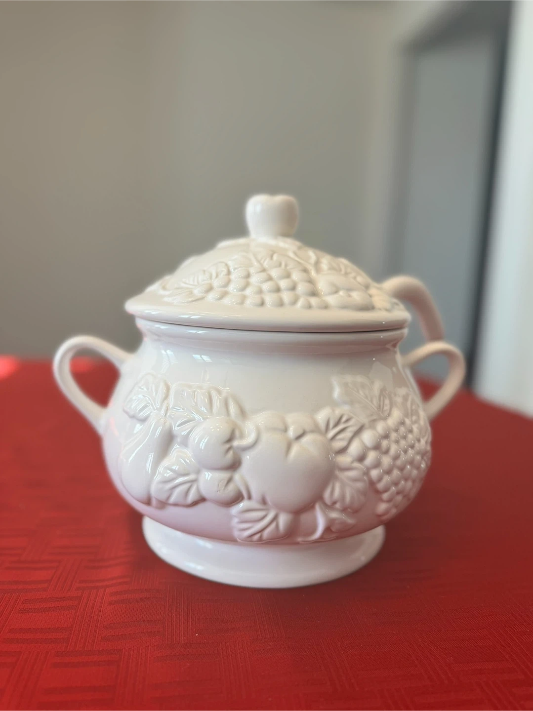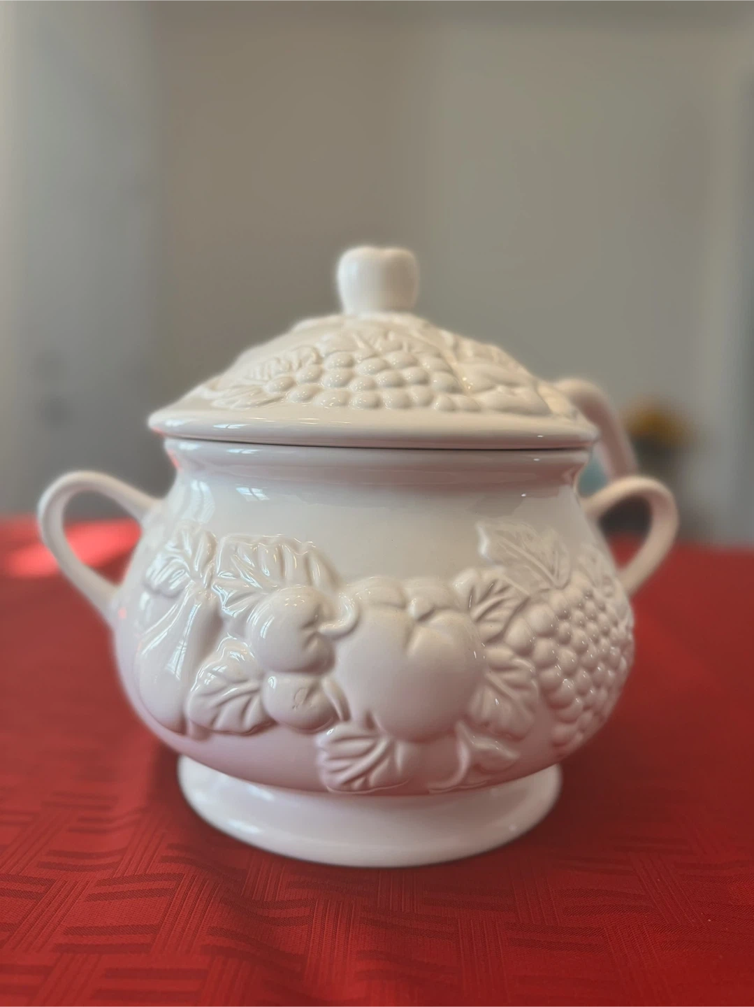 I'm selling a vintage ceramic soup tureen with a lid. It's in great condition and features a charming fruit design with grapes and apples. Perfect for adding a touch of vintage elegance to your kitchen or dining table! New and never been used.