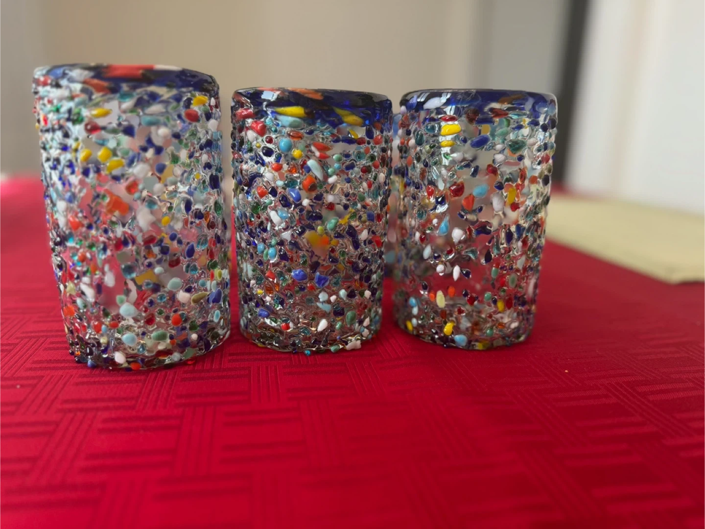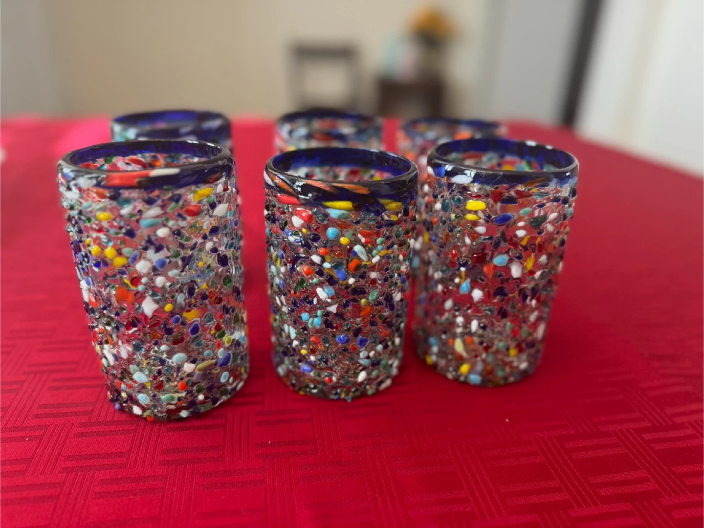 I'm selling a set of six hand-blown Mexican drinking glasses. They have a festive and colorful design that would brighten up any table! They are in excellent condition and ready for a new home. Perfect for parties or everyday use! New and never been used.