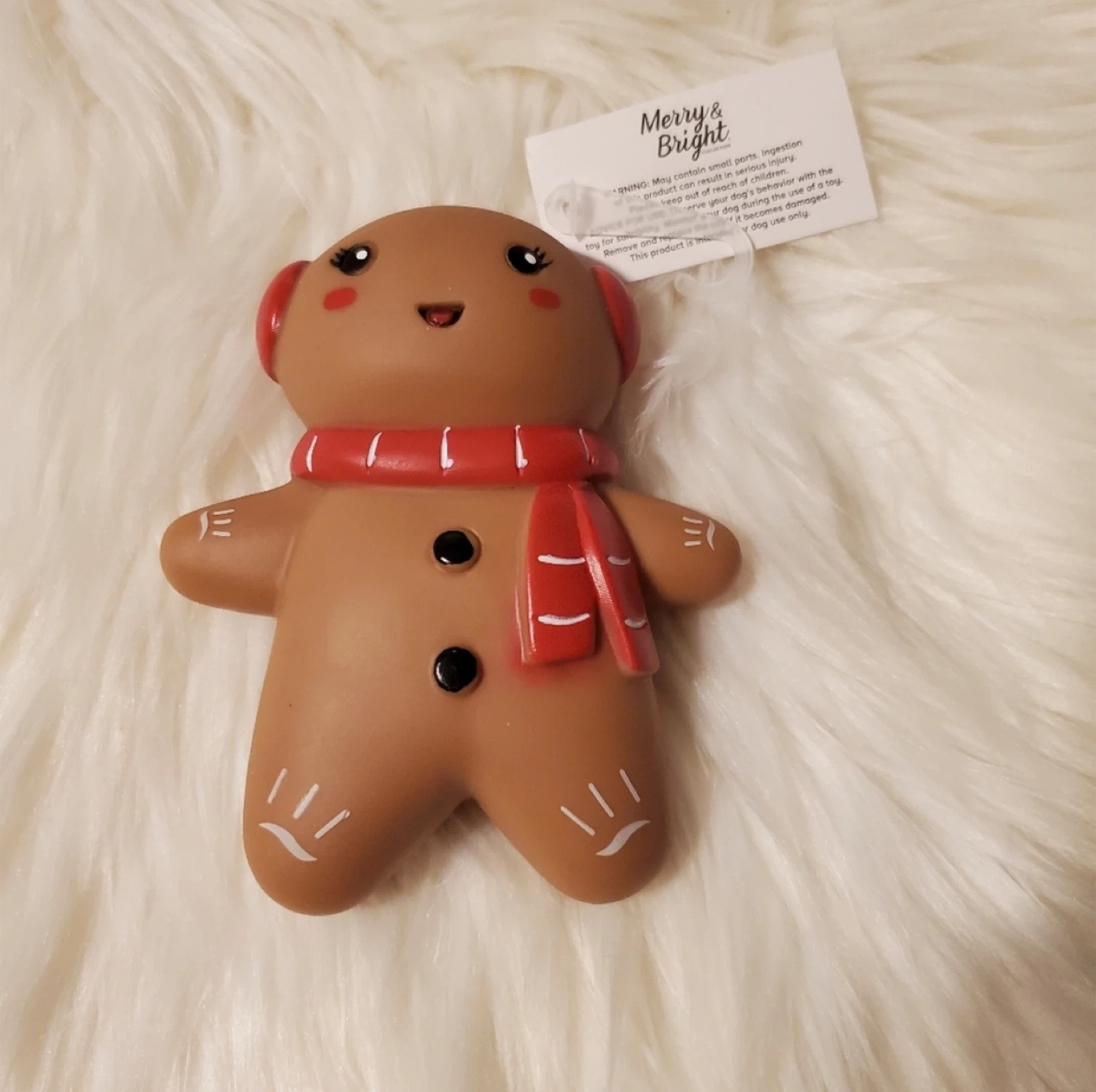 This is a cute gingerbread man dog toy from Merry & Bright! It's in great condition and ready for a new furry friend to play with