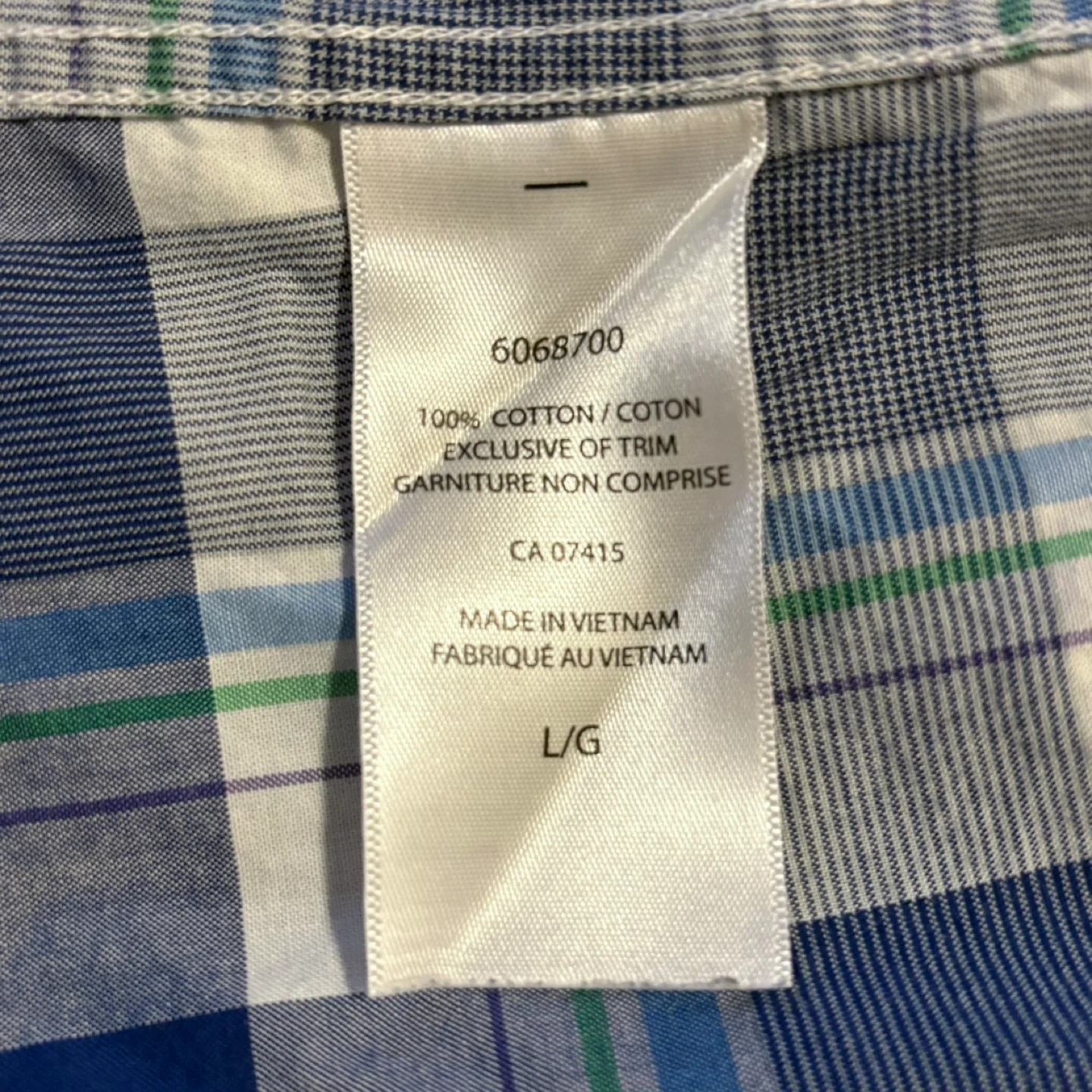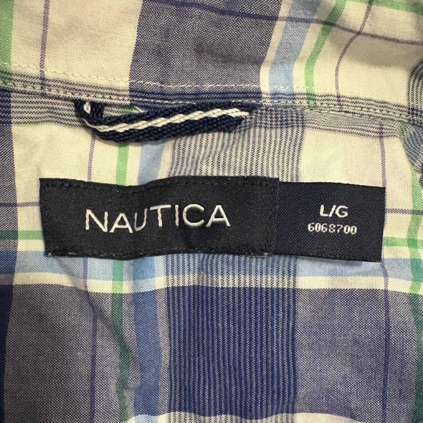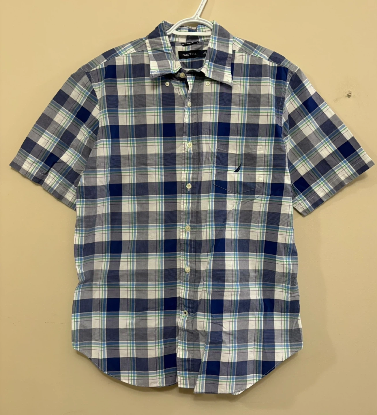 Nautica short-sleeve shirt in a blue and white plaid pattern. It's made from 100% cotton and is a size large.
